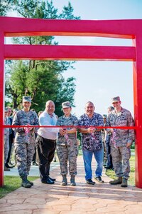 The 18th Force Support Squadron officially opened a new Nature Play Area at Marek Park on Kadena Sept. 30, 2014. U.S. Air Force Col. Debra Lovette, 18th Mission Support Group commander, provided comments about the park and then cut the ribbon joined by personnel from 18th FSS, 18th Contracting