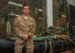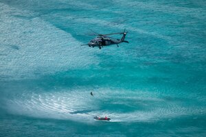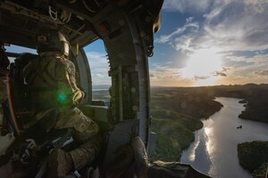 U.S. Air Force Staff Sgt. Jose Diaz de Leon, special mission aviator assigned to the 33rd Rescue Squadron, looks out the gunner’s window aboard an HH-60G Pave Hawk, July 31, 2019, out of Kadena Air Base, Japan. The HH-60G Pave Hawk, or Precision Avionics Vectoring Equipment, has a hoist that can