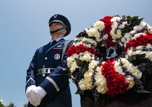 May 28, 2018 Team Kadena honors fallen at Memorial Day Ceremony A Kadena Air Base honor guardsman stands next to a wreath during a Memorial Day ceremony May 25, 2018, at Kadena Air Base, Japan. Members of Team Kadena gathered to remember and honor U.S. service members who paid the ultimate sacrifice for their country. (U.S. Air Force photo by Staff Sgt. Micaiah