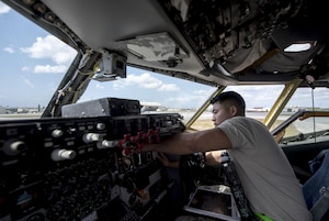 U.S. Air Force Airman 1st Class Ryan Celestino, 909th Aircraft Maintenance Unit instrument and flight control systems journeyman, removes and replaces a digital speed indicator from the dashboard of a KC-135R March 15, 2017, at Kadena Air Base, Japan. Maintainers from the 909th AMU ensure that the