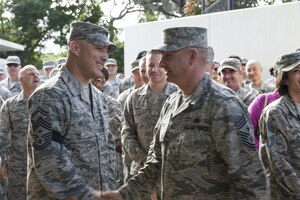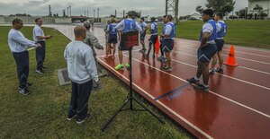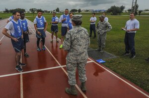 U.S. Air Force Airmen participate in the run portion of the physical fitness test with physical training leaders, Dec. 1, 2016, at the Risner Fitness Center on Kadena Air Base, Japan. The running portion of the physical fitness test is a key part of the test and worth the most points toward a total