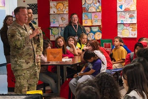 18th Wing leadership visited Amelia Earhart Intermediate School to thank fourth grade students for boosting holiday support to the community at Kadena Air Base, Japan, Dec. 3, 2025. Students at the school helped fundraise over 900 pounds of food to serve 73 families in need during Thanksgiving week.