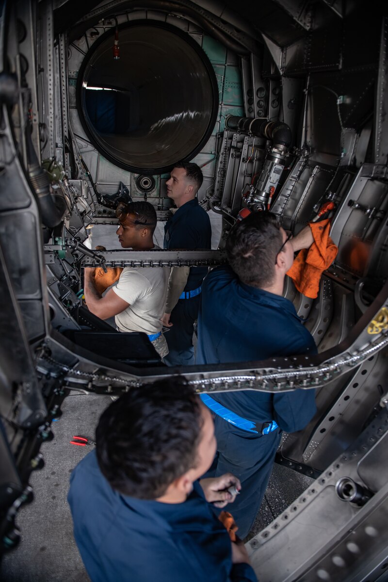 U.S. Air Force Airman 1st Class Nathaniel West, 18th Aircraft Maintenance Squadron crew chief, cleans an F-15 Eagle engine bay compartment, Jan. 18, 2019, on Kadena Air Base, Japan. Over time, dirt, grease and grime can build up in the aircrafts engine bay and can cover up cracks or other discrepancies on the aircraft. (U.S. Air Force photo by Staff Sgt. Micaiah Anthony)