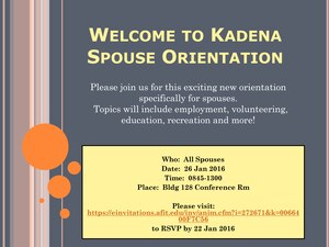The Airman and Family Readiness Center and the Community Support Coordinator Office will be hosting a "Welcome to Kadena" Spouse Orientation Jan. 26, at the Schilling Community Center from 9 a.m. until 1 p.m.According to Lisa Velez, 18th Wing community support coordinator, the goal of the