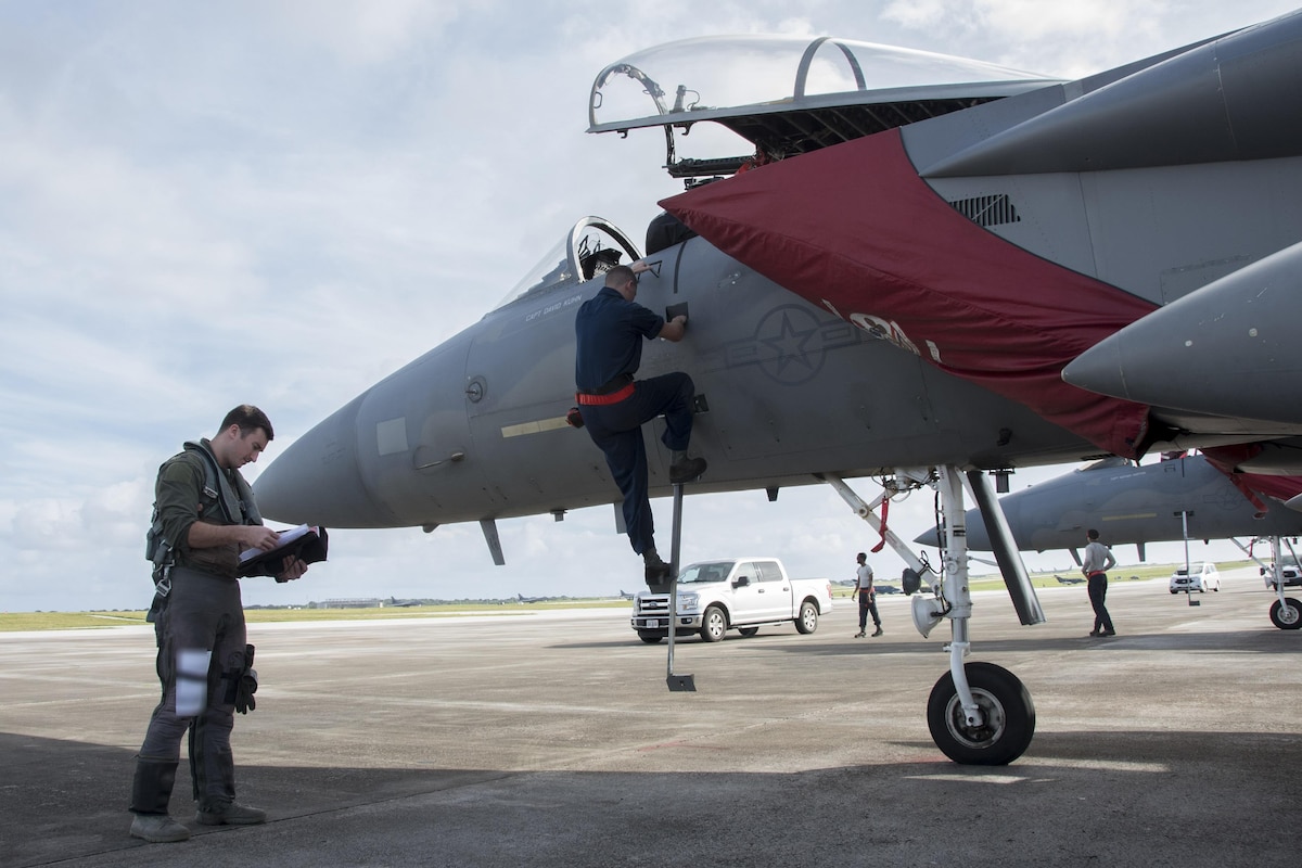 A U.S. Air Force F-15 Eagle from the 67th Fighter Squadron takes off Feb. 20, 2017, at Andersen Air Force Base, Guam. The 67th FS, from Kadena Air Base, Japan, is conducting an array of flight operations with other units from U.S. Pacific Air Forces, along with the U.S. Navy and Japan and Australian air forces. The annual exercise provides opportunities for allied units to develop combat capabilities, enhance air superiority, electronic warfare, air interdiction, tactical airlift and aerial refueling. (U.S. Air Force photo by Senior Airman John Linzmeier/released)