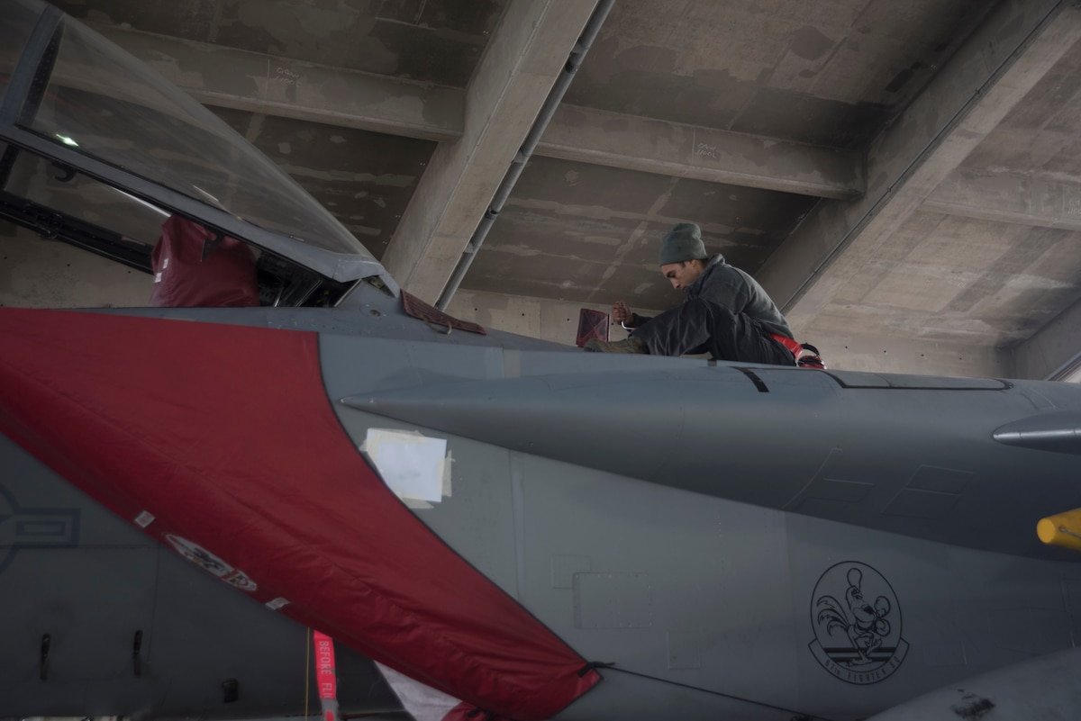 U.S. Air Force Senior Airman Devin Moore, 67th Fighter Squadron crew chief, checks and installs a panel on an F-15 Eagle Jan. 11, 2018, at Kadena Air Base, Japan. Aircraft assigned to Kadena support a variety of missions and exercises throughout the Indo-Asia Pacifica area of responsibility. (U.S. Air Force photo by Senior Airman Quay Drawdy)
