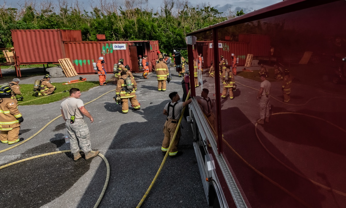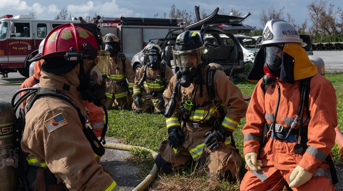 U.S. Air Force firefighters from the 18th Civil Engineer Squadron and Japan Air Self Defense Force firefighters from the 9th Wing, Naha Air Base, Japan, prepare to start structural live fire training Nov. 15, 2018, at Kadena Air Base, Japan. The training enabled both units to hone their techniques, meet annual requirements, develop communication skills and foster team building. (U.S. Air Force photo by Staff Sgt. Micaiah Anthony)
