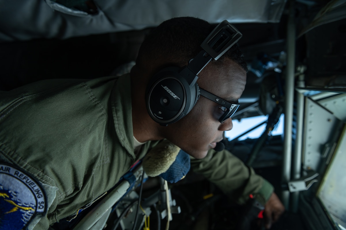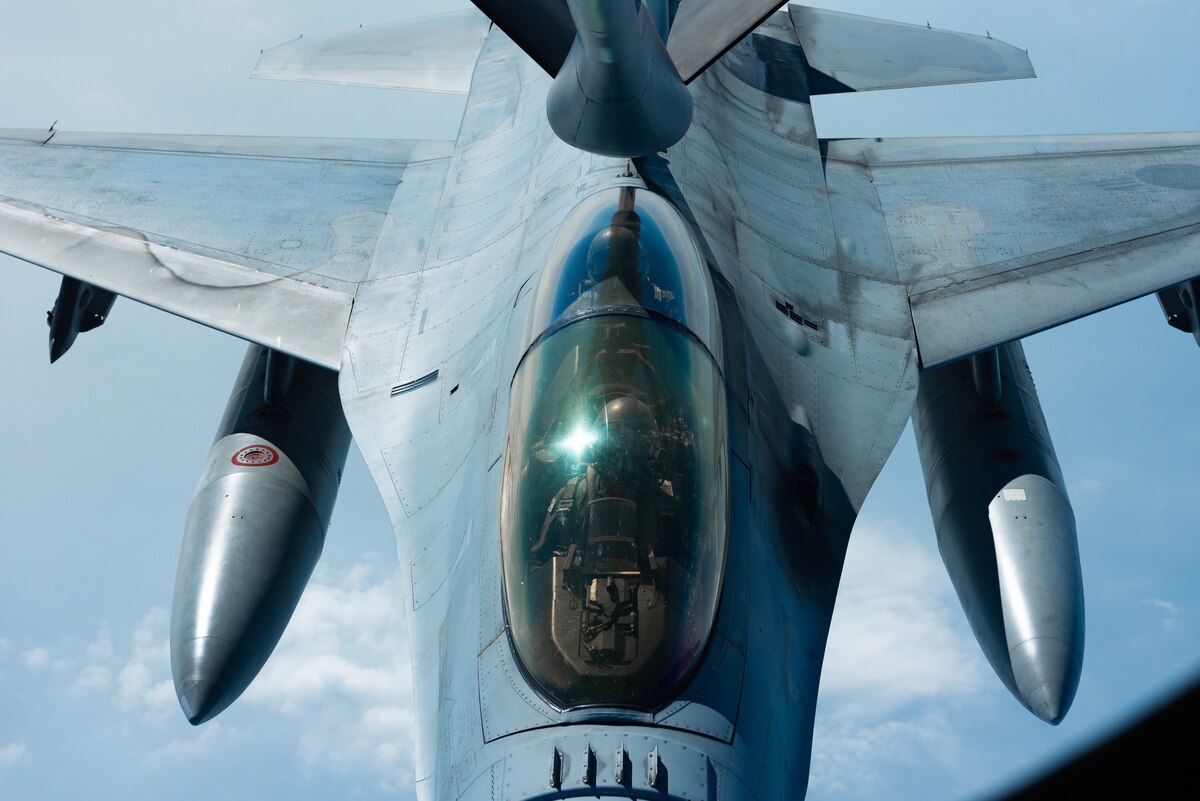 A Republic of Korea Air Force F-16D Fighting Falcon refuels with a KC-135 Stratotanker from the 909th Air Refueling Squadron during a training exercise Oct. 8, 2019. The 909th ARS from Kadena Air Base trained with the ROKAF Falcons to deepen interoperability, enhancing joint lethality to maintain peace in a contested environment. The U.S. Indo-Pacific Command is committed to enhancing stability in the Asia-Pacific region by promoting security cooperation, encouraging peaceful development, responding to contingencies, deterring aggression, and, when necessary, fighting to win. This approach is based on partnership, presence, and military readiness. (U.S. Air Force photo by Senior Airman Cynthia Belío)