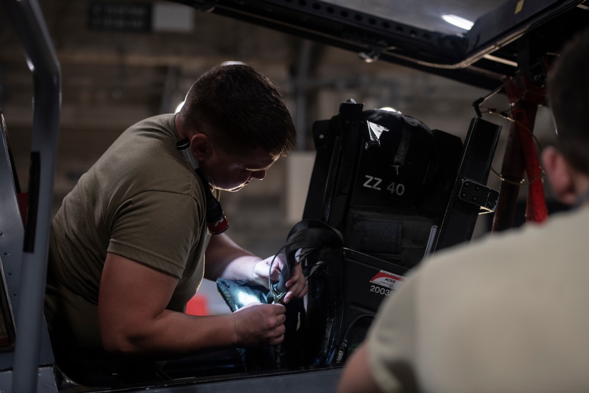 U.S. Air Force Tech. Sgt. Michael Solomon, 18th Component Maintenance Squadron F-15 craftsman, left, and Airman 1st Class Grant McFall, 18th CMS F-15 apprentice, prepare to perform a 30-day egress final on an F-15C Eagle at Kadena Air Base, Japan, Sept. 19, 2019. During the routine inspection, the technicians check every component of the egress system for wear or damage, and any expired time-changeable parts are swapped out. (U.S. Air Force photo by Tech. Sgt. Matthew B. Fredericks)