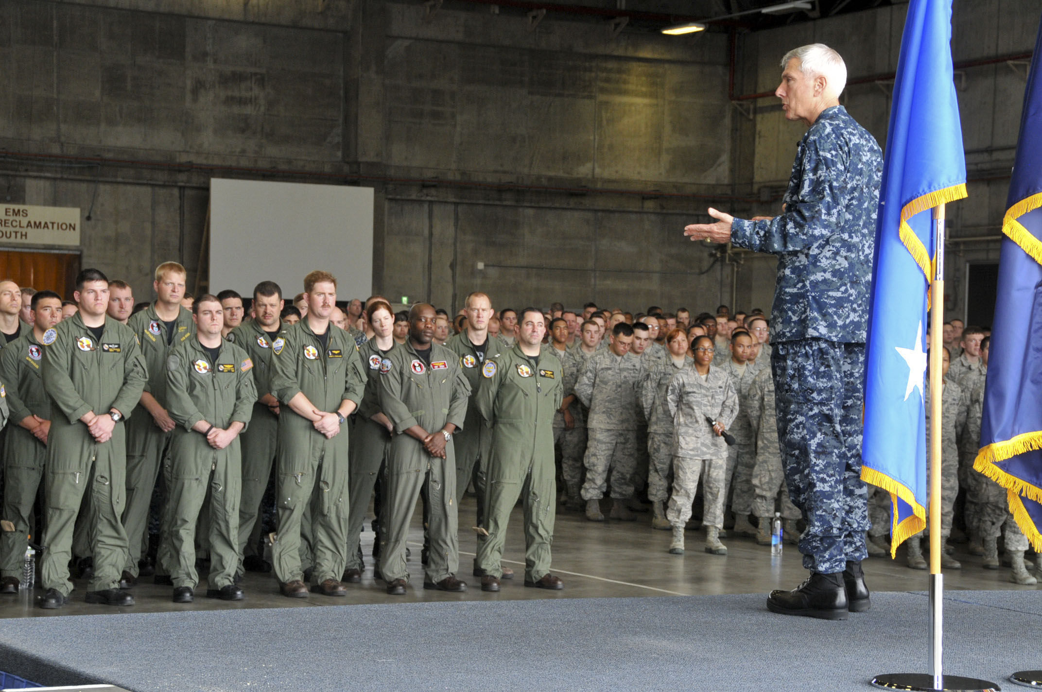 U.S. Navy Adm. Samuel Locklear, U.S. Pacific Command commander, speaks with Airmen, Sailors, Marines, and Soldiers during an all service call April 13, at Kadena Air Base, Japan. Locklear explained his priorities as the PACOM commander and answered questions from service members about region affairs. This was the admiral's first visit to Japan since assuming command in March 2012. (Photo by U.S. Air Force Staff Sgt. Darnell T. Cannady/Released)