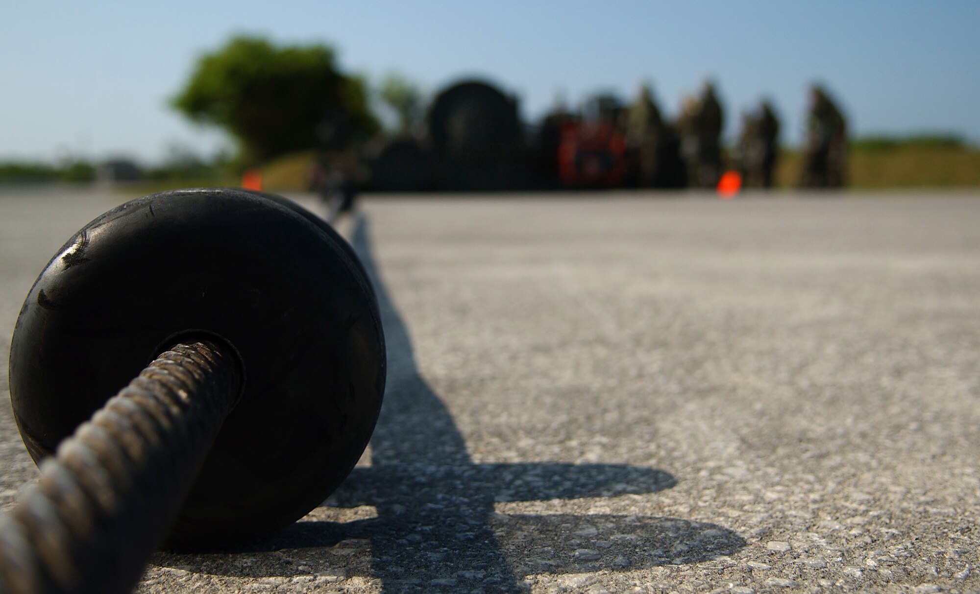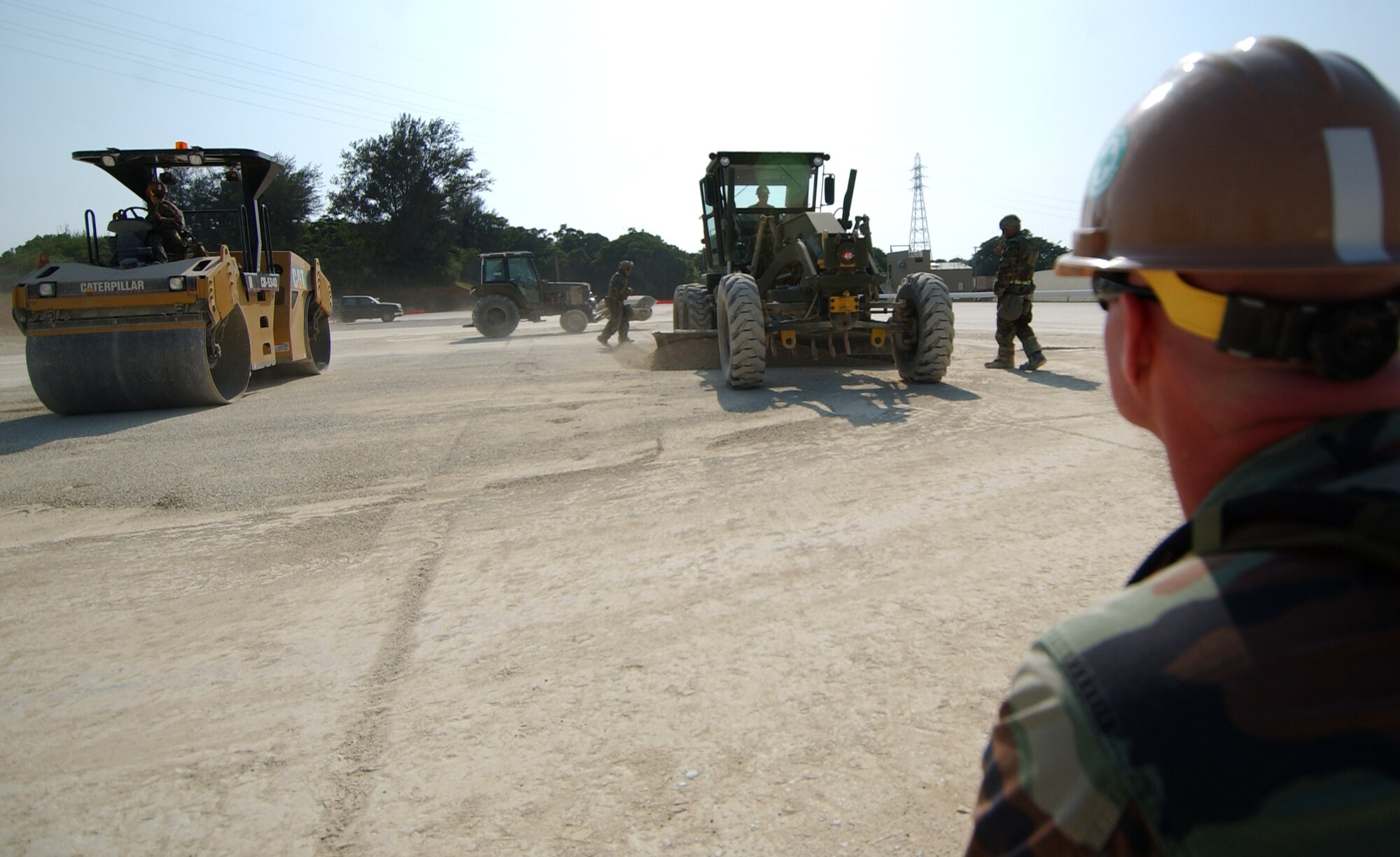 The 18th Civil Engineer Squadron and the Navy Seabees use heavy machinery to repair a simulated damaged runway at Kadena Air Base, Japan May 14, 2009. During the 18th Wing's weeklong local operational readiness exercise, the crews worked to patch 10-foot deep holes caused by mock bomb explosions. This was the first time both organizations practiced ADR in a simulated combat zone. The Seabees are in a 6 month rotation here and are being integrated into training with Airmen to capitalize on all engineering assets and fulfill the mission here.