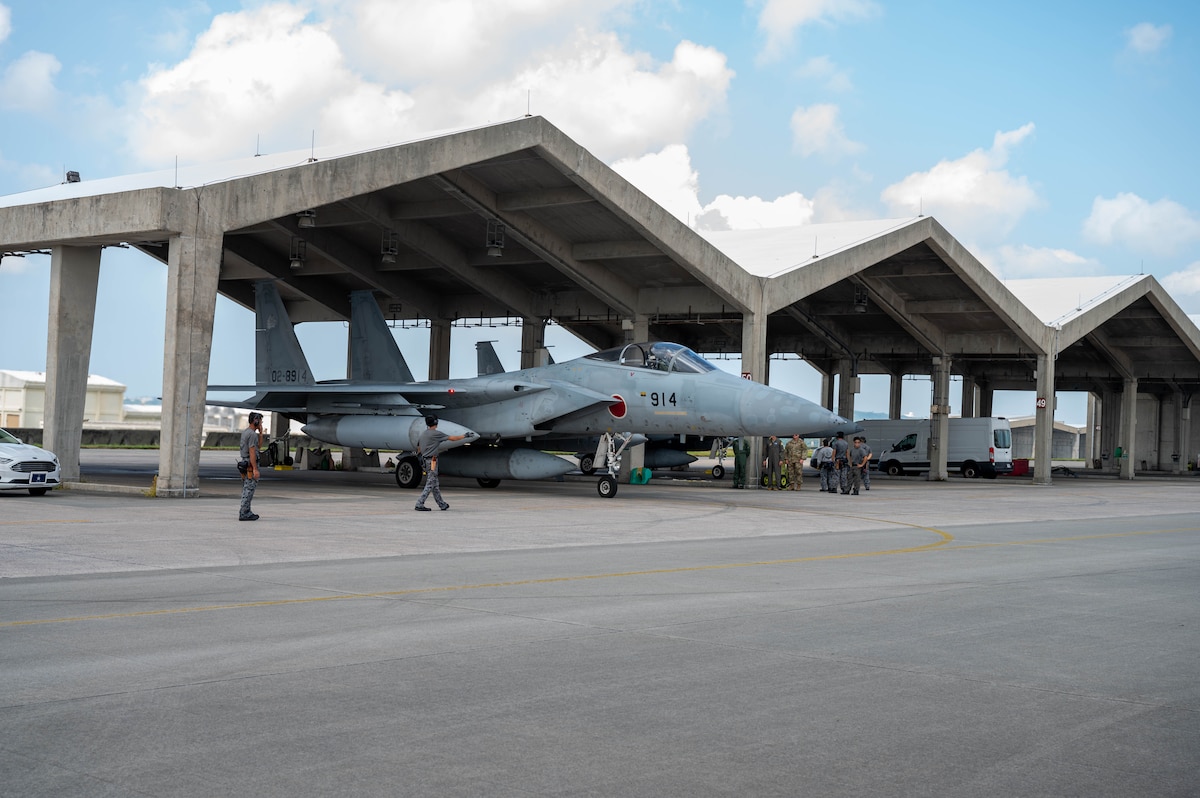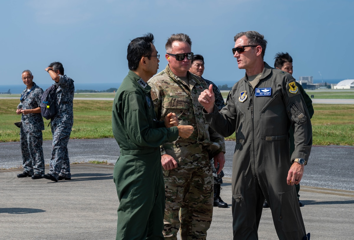 KADENA AIR BASE, Japan -- Southwestern Air Defense Force Lt. Gen. Takayuki Terasaki, SWADF commander, comes to Kadena Air Base for a visit to meet with U.S. Air Force Brig. Gen. John Gallemore, 18th Wing commander, and Chief Master Sgt. William Cupp, 18th Wing command chief, to discuss bilateral training and to receive a tour of the base and view the take offs and landings of JASDF aircraft.