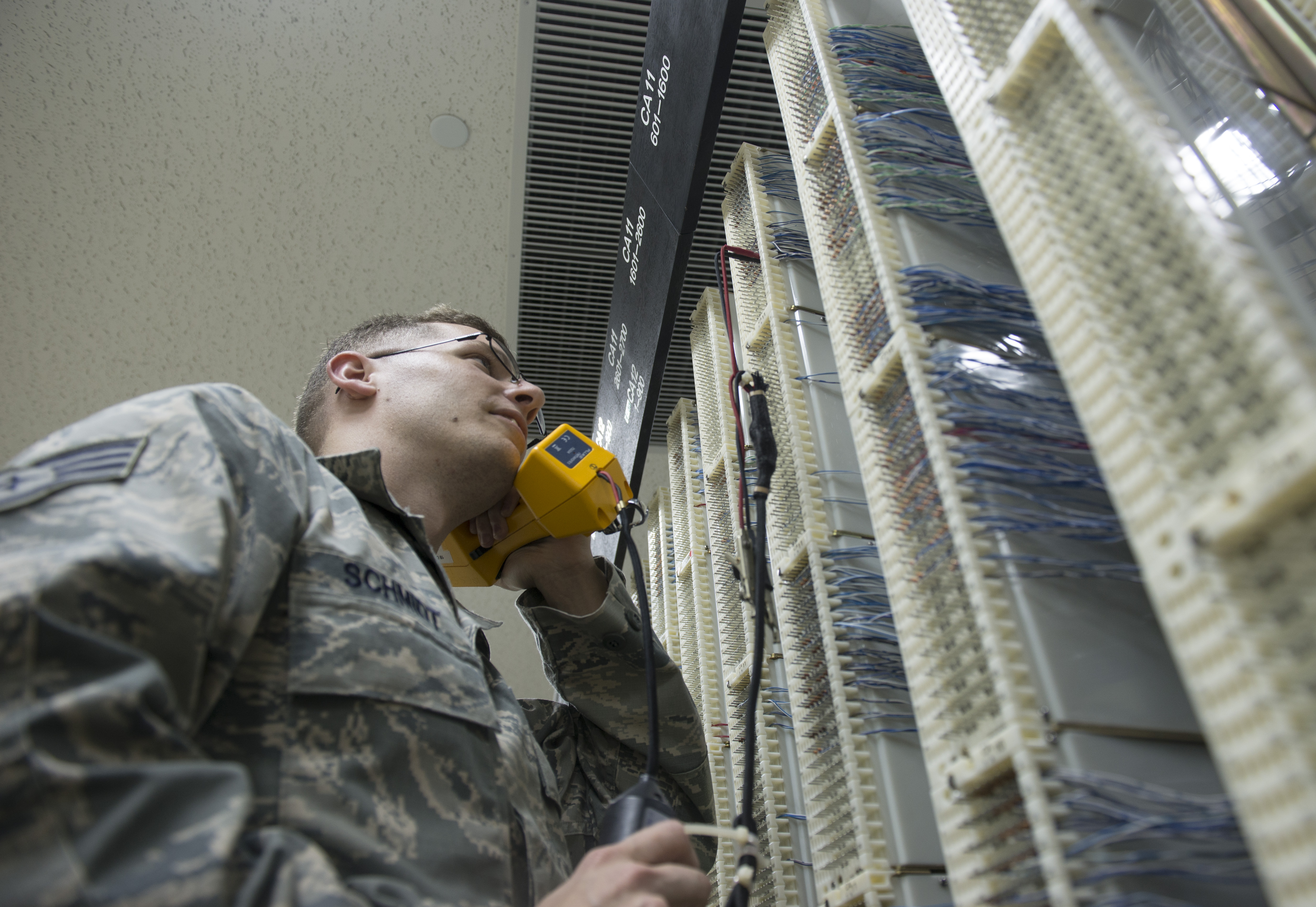 U.S. Air Force Airman 1st Class Noah Landa, 18th Communications Squadron cyber transport technician, terminates a line to a line equipment number block April 20, 2016, at Kadena Air Base, Japan. The Telephone Switch End-Office supports more than 36,000 people on Kadena Air Base. (U.S. Air Force photo by Senior Airman Omari Bernard)