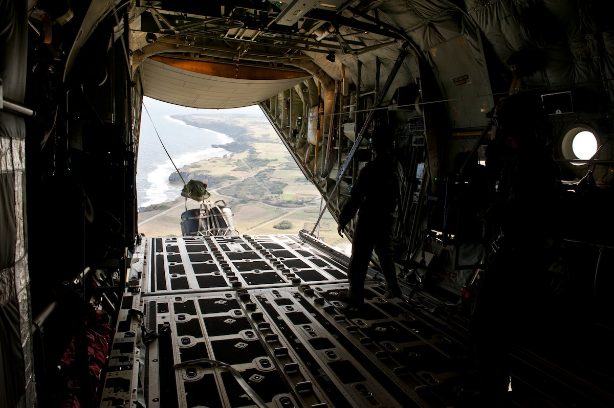 U.S. Air Force Senior Airman Zach Harmon, 17th Special Operations Squadron MC-130J Commando II loadmaster, releases a cargo delivery system over a drop zone during a training exercise Feb. 17, 2016, Okinawa, Japan. Harmon and other 17th SOS Jackals conducted a quick-reaction, full-force sortie that tested the unit's ability to safely execute a five-ship formation flight, cargo drops, short runway landings, and takeoffs, and helicopter air-to-air refueling. (U.S. Air Force photo by Senior Airman Peter Reft)