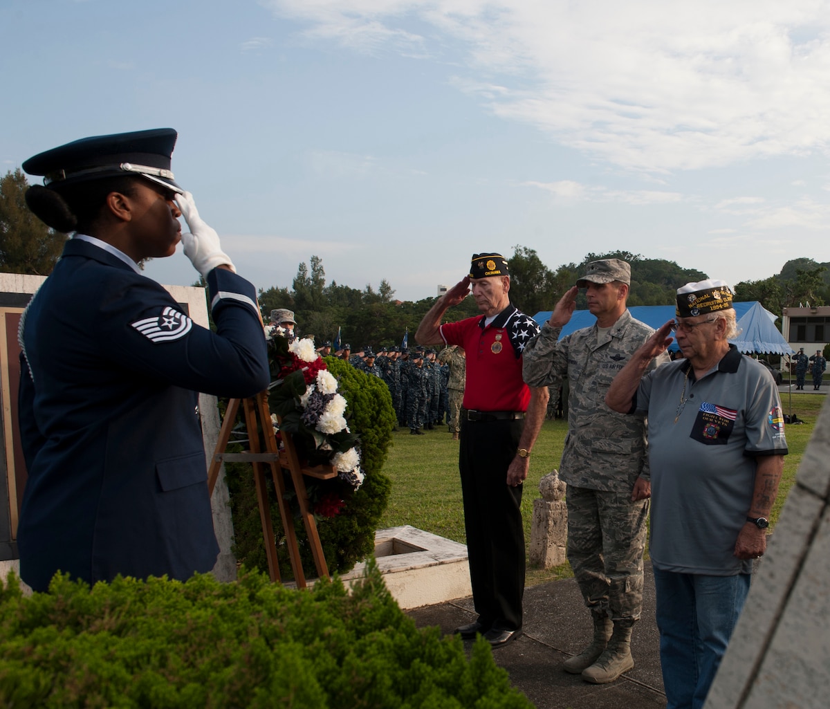 U.S. Air Force Brig. Gen. Barry Cornish, 18th Wing commander, and wife, Missy, wave to attendees of Kadena's first Veterans Day parade Nov. 11, 2015, at Kadena Air Base, Japan. Veterans Day, originally known as Armistice Day, was first observed to commemorate the armistice which went into effect Nov. 11, 1918, and led to the end of World War I. (U.S. Air Force photo by Master Sgt. Jason W. Edwards)