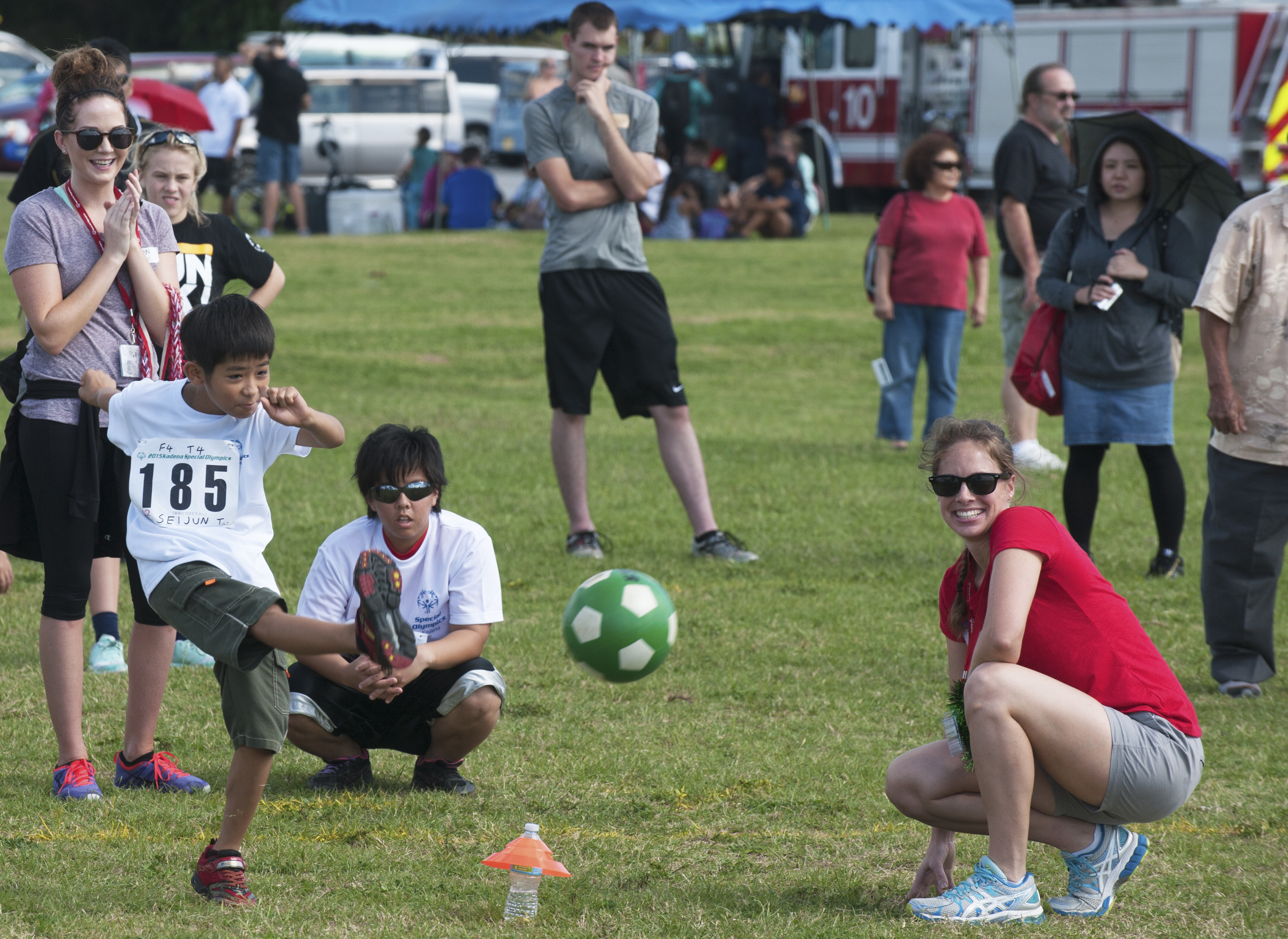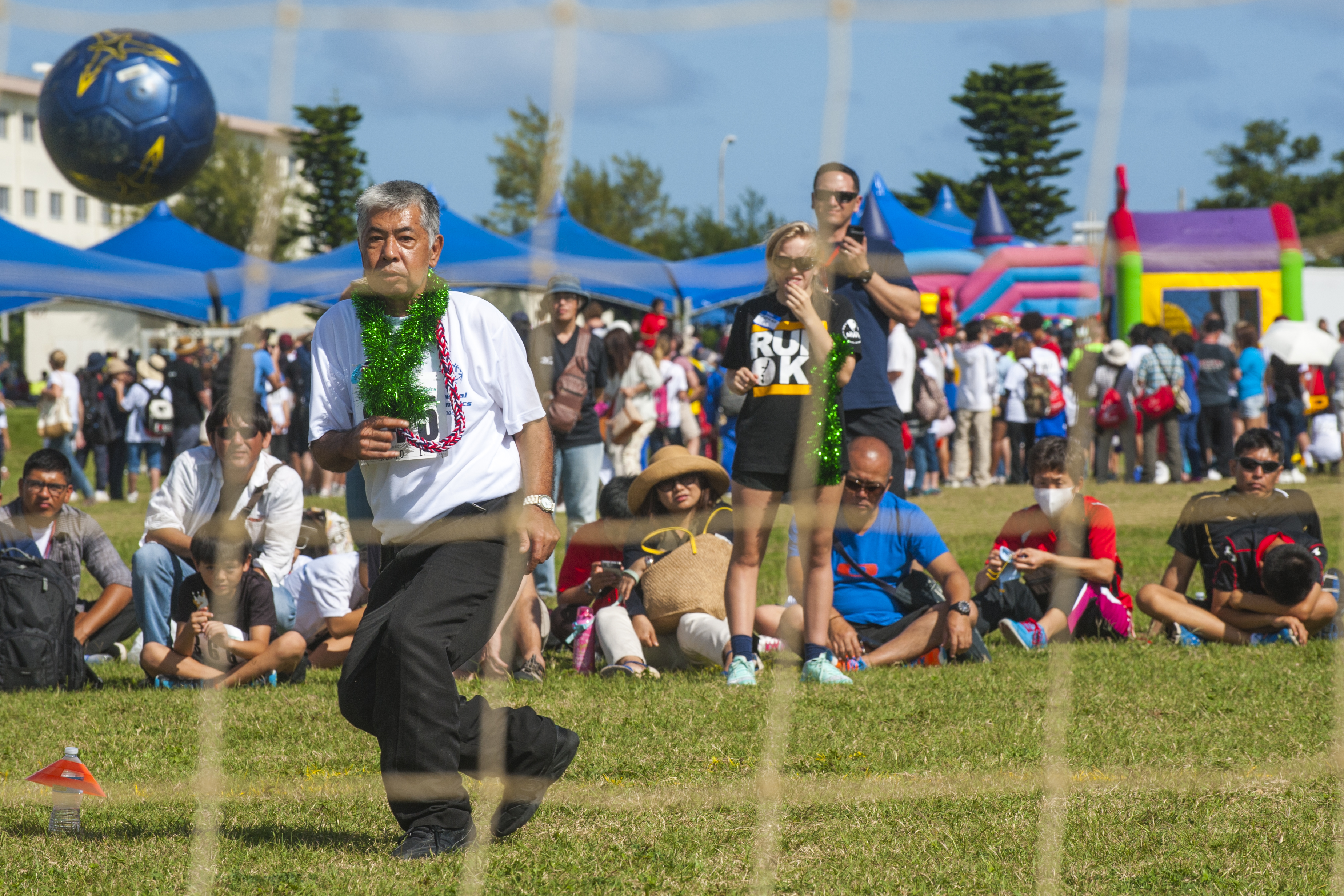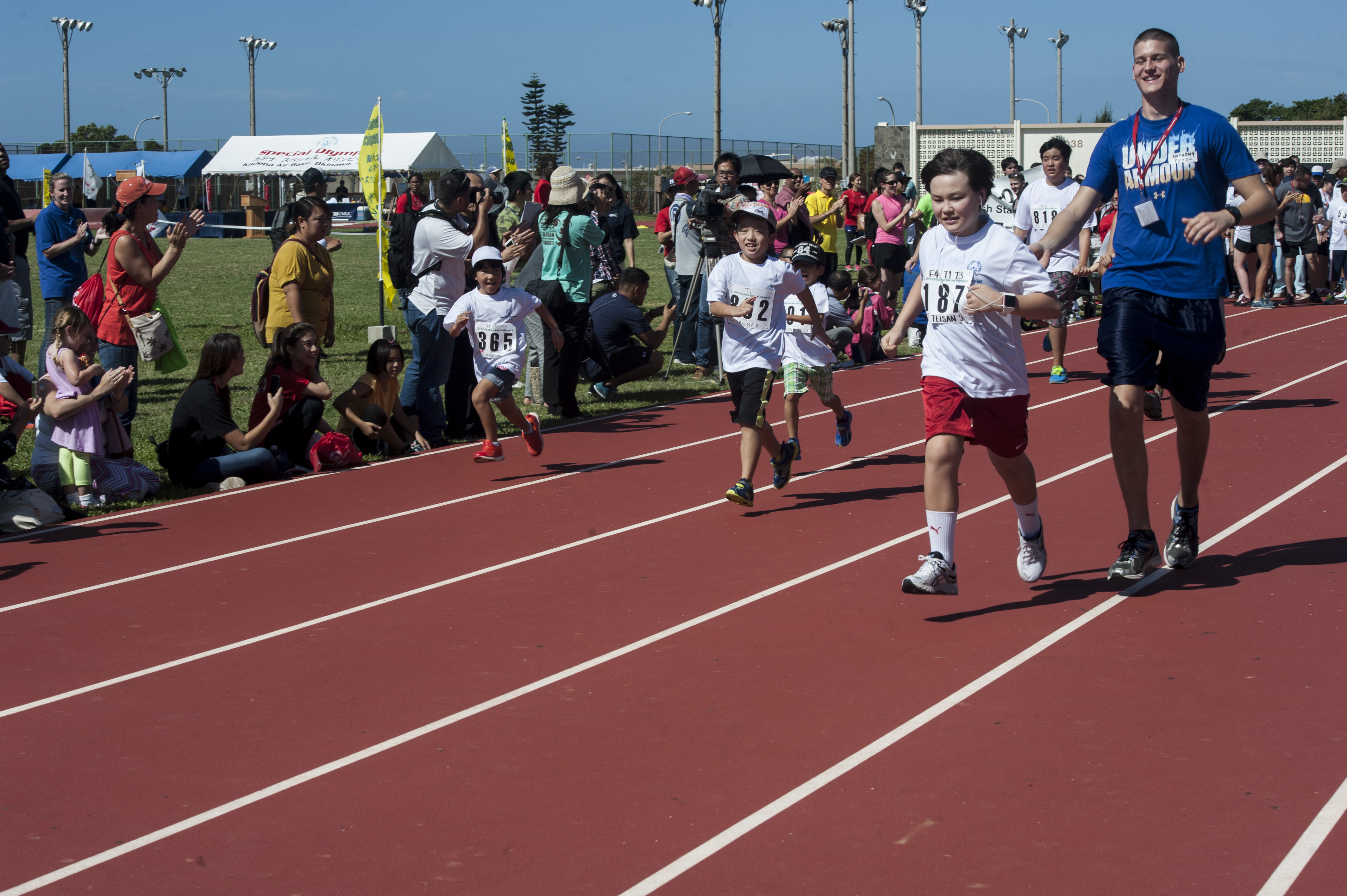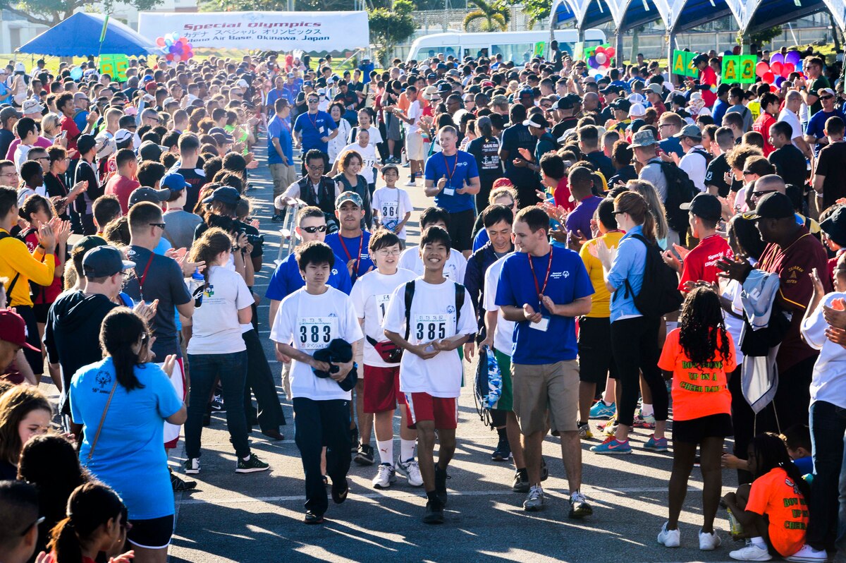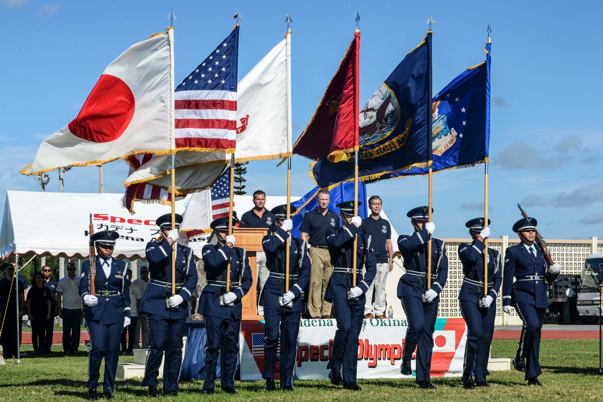 U.S. Air Force Brig. Gen. Barry Cornish, 18th Wing commander, U.S. Air Force Lt. Gen. John Dolan, U.S. Forces Japan and 5th Air Force commander, and Masaru Machida, Okinawa Prefectural Government Executive Office of the Governor director general, stand as the U.S. National Anthem is played during the Kadena Special Olympics opening ceremony Nov. 7, 2015, at Kadena Air Base, Japan. The KSO is sponsored by the 18th Wing and the Friends of Kadena Special Olympics in partnership with the Okinawa Prefectural Government, Okinawa City, Kadena Town, Chatan Town and all U.S. military services on island. (U.S. Air Force photo by Senior Airman John Linzmeier)