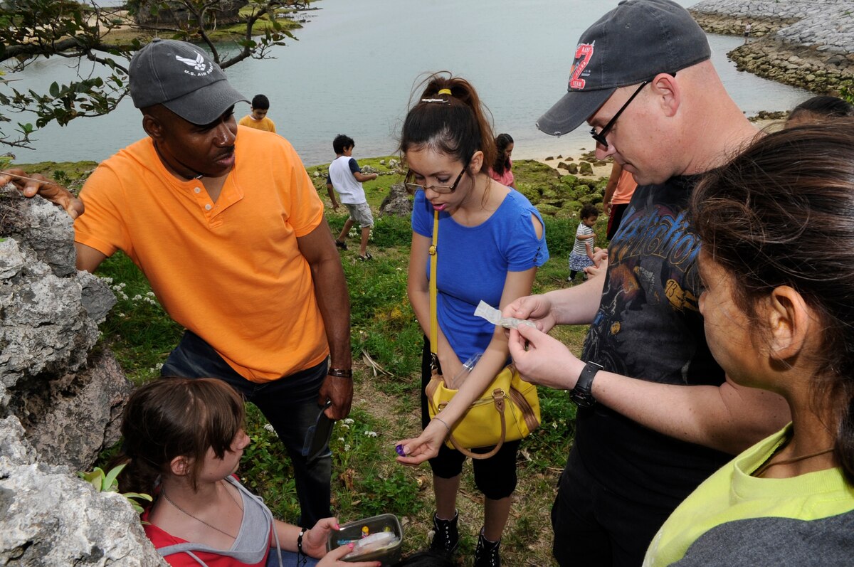 Catholic youth group members from Kadena Air Base, Japan, pose for a photo after finding a geocoin while geocaching near Araha Beach, Japan, March 21, 2015. Geocaching is a new century treasure hunt using GPS and clues provided on a website. Geocoins can occasionally be found in geocaches and are meant to be taken, placed in different caches and tracked around the world. (U.S. Air Force photo by Staff Sgt. Marcus Morris)