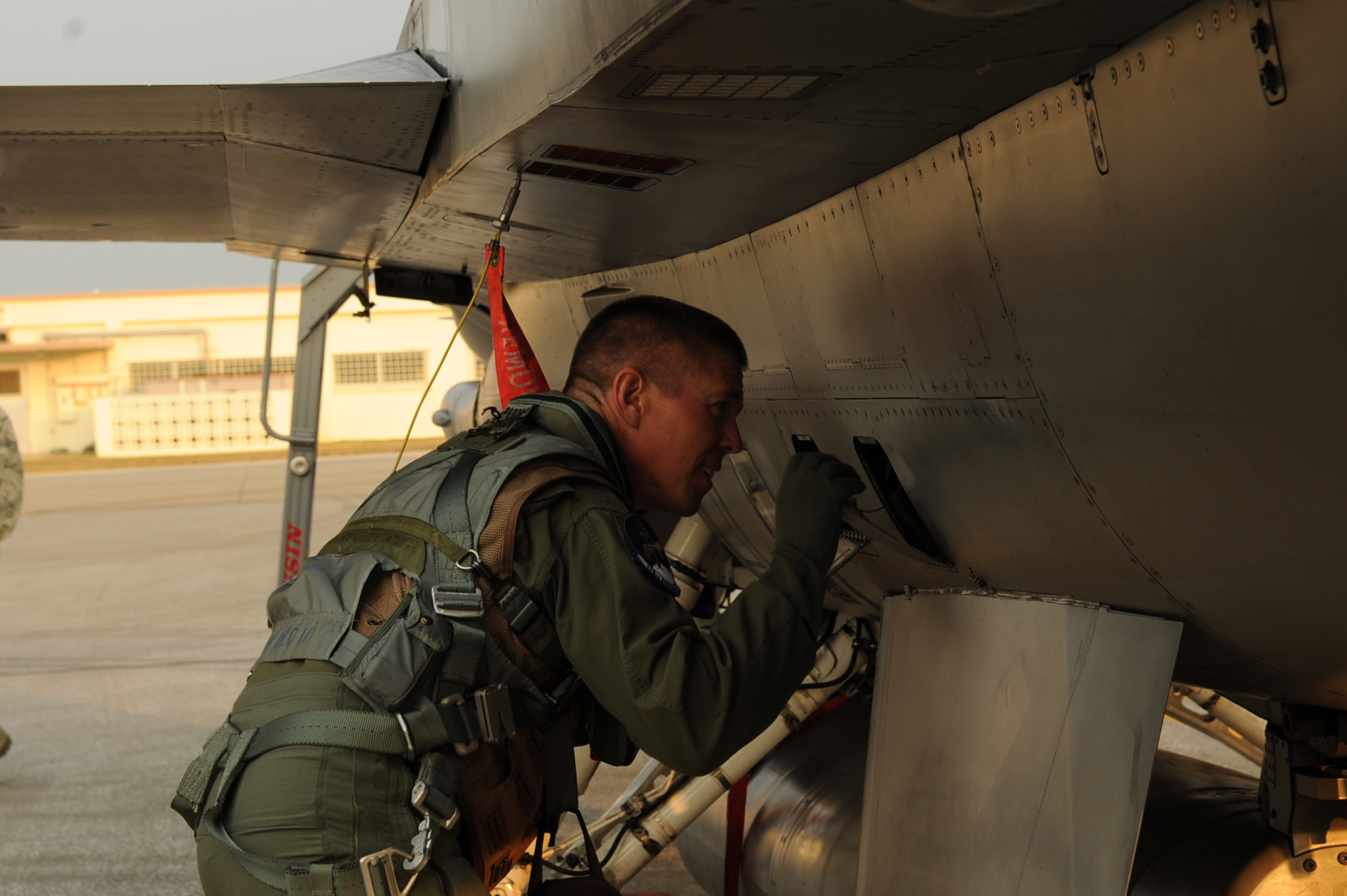 Members of the Wisconsin Air National Guard, 115th Fighter Wing, pose for a group photo after U.S. Air Force Lt. Col. Matthew C. McCunn, 115th Fighter Wing pilot, completed his 3,000th flight hour at Kadena Air Base, Japan, Feb. 13, 2015. McCunn was deployed with his Air National Guard unit from Wisconsin to Kadena for joint training with the 18th Wing. (U.S. Air Force photo by Airman 1st Class Zackary A. Henry)