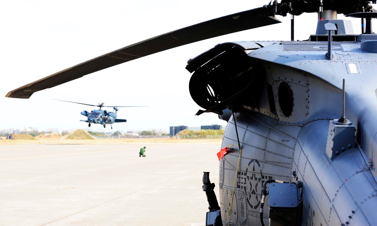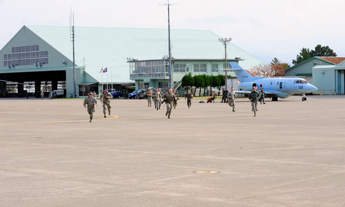 U.S. Air Force personnel sprint to U.S. Air Force HH-60G Pave Hawk helicopters in response to an exercise scenario on Komatsu Air Base, Japan, Nov. 12, 2014. The scenario was part of exercise Keen Sword 2015, a joint-bilateral training exercise designed to increase the interoperability required to support the defense of Japan, respond to a potential crisis and offer humanitarian assistance. The Pave Hawks are assigned to the 33rd Rescue Squadron stationed at Kadena Air Base, Japan. (U.S. Air Force photo by 2nd Lt. Erik Anthony/Released)