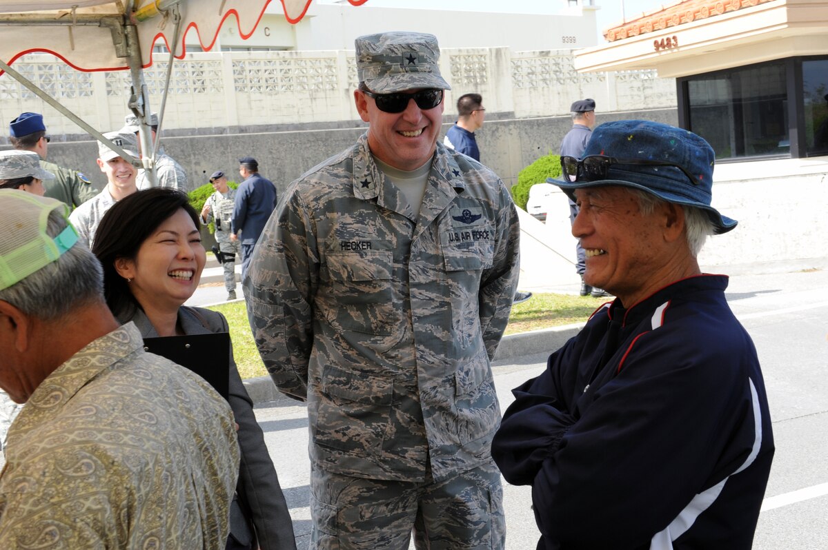 Masaharu Noguni, Chatan Town mayor and U.S. Air Force Brig. Gen. James Hecker, 18th Wing commander, speak to tsunami evacuation exercise participants on Kadena Air Base, Japan, Nov. 5, 2014. Chatan Town residents participated in a mock tsunami in order to practice evacuating from low elevation areas near the Sunabe seawall to higher ground on Kadena. The exercise was organized in support of an agreement signed by Noguni and Hecker in April that allows local Okinawans access to Kadena in the event of a natural disaster. (U.S. Air Force photo by Airman 1st Class Zade C. Vadnais/Released)