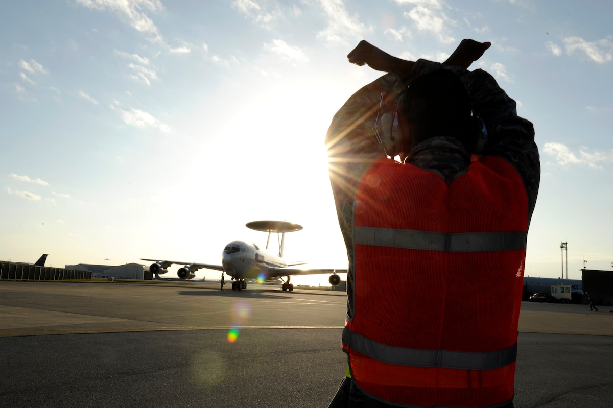 U.S. Air Force Airman 1st Class Timothy Bailey, 961st Aircraft Maintenance Unit propulsion technician, waits to marshal a 961st Airborne Air Control Squadron E-3 Sentry Airborne Warning and Control aircraft onto the Kadena Air Base, Japan, flightline Jan. 28, 2014. With its surveillance and reconnaissance mission, the AWACS aircraft from the 961st AACS provide Kadena visibility of virtually everything in the air and allows Kadena and other Air Force assets to project superior force for any operation. (U.S. Air Force photo by Senior Airman Maeson L. Elleman)