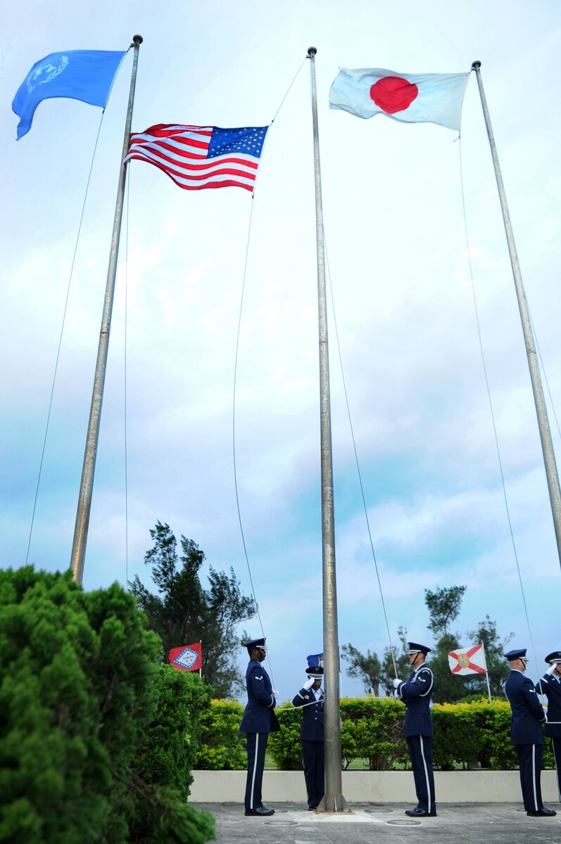 Charles Cathey (right), Okinawa American Legion post 28 commander, U.S. Air Force Col. Brian McDaniel, 18th Wing vice commander, and Dennis Provencher, Okinawa Veterans of Foreign Wars post 9723 commander, salute a POW/MIA wreath as it is placed in front of the command building flagpoles during a Veterans Day ceremony at Kadena Air Base, Japan, Nov. 11, 2013. President Woodrow Wilson first commemorated Nov. 11 as Armistice Day in 1919 to honor the veterans of World War I. The day was later changed to Veterans Day in 1954 by President Dwight Eisenhower to honor all veterans from all U.S. conflicts. (U.S. Air Force photo by Staff Sgt. Amber E. N. Jacobs)