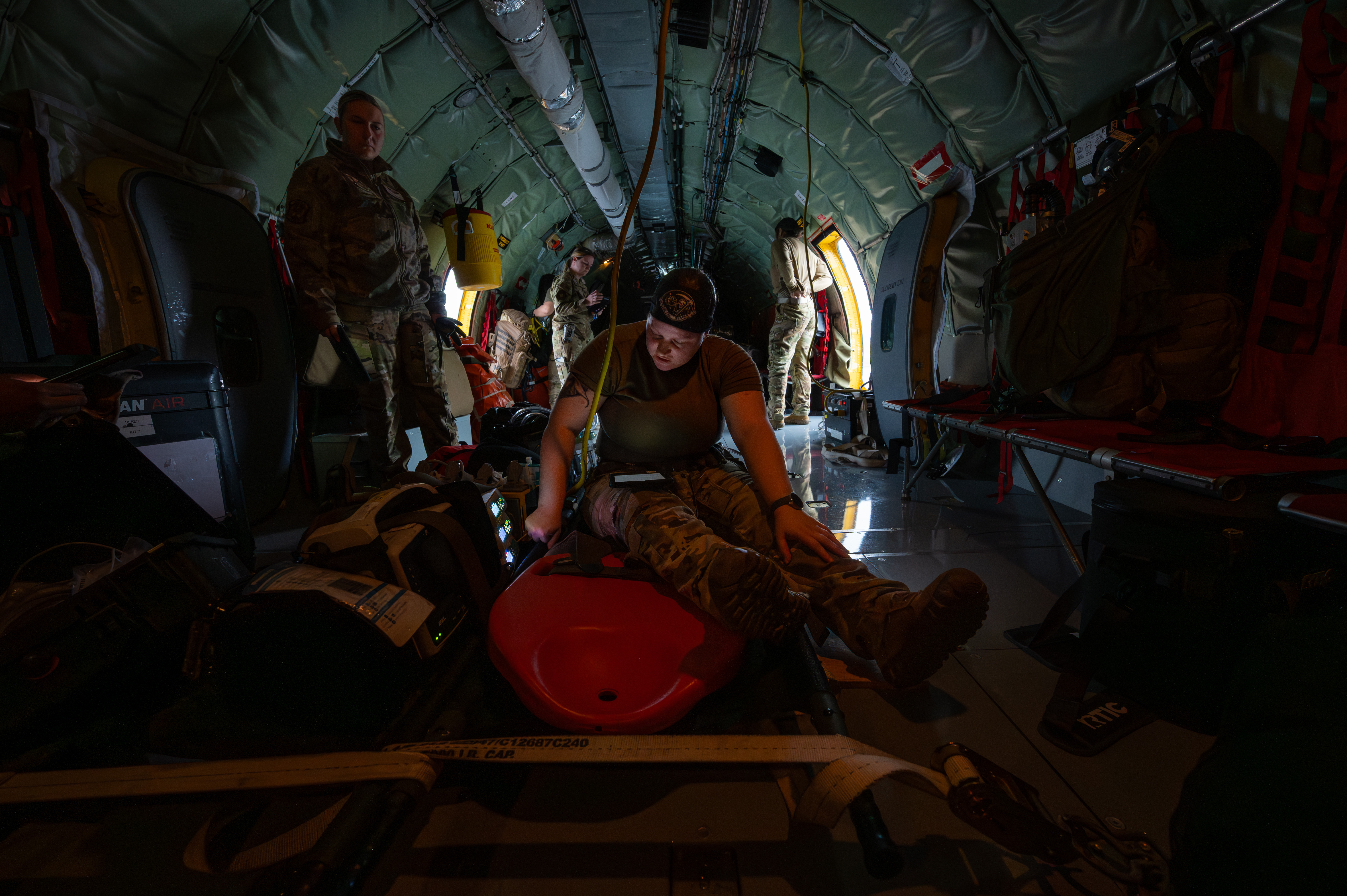U.S. Air Force Airmen assigned to the 18th Aeromedical Evacuation Squadron prepare to treat simulated patients aboard a KC-135 Stratotanker assigned to the 909th Air Refueling Squadron, on Kadena Air Base, Japan, Feb. 17, 2026. The 18th AES is the sole aeromedical evacuation unit in the U.S. Indo-Pacific Command, providing 24/7 critical care and transport for wounded personnel. (U.S. Air Force photo by Staff Sgt. Gary Hilton)