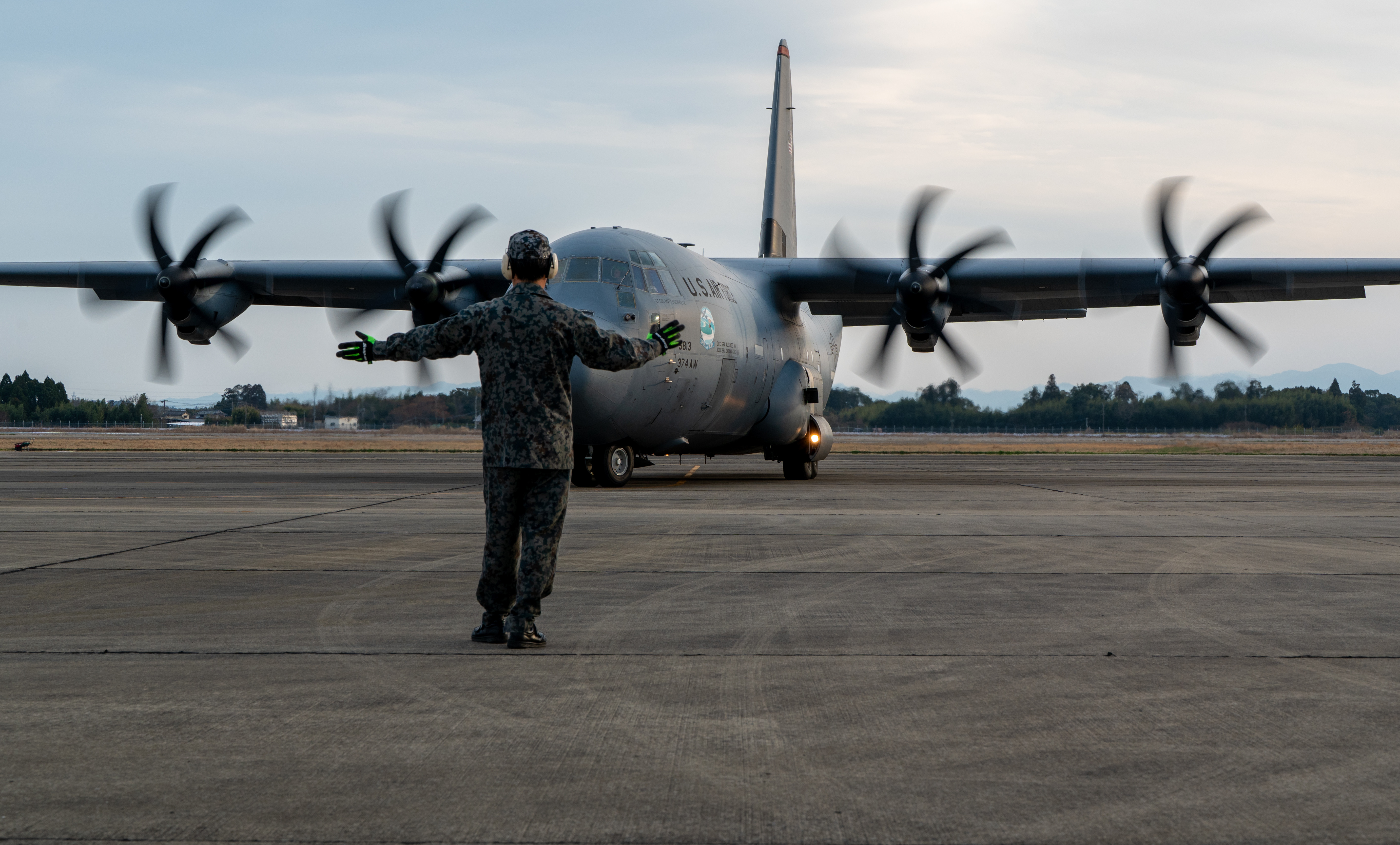 A Japan Air Self-Defense Force member marshals a U.S. Air Force C-130J Super Hercules assigned to the 36th Airlift Squadron, Yokota Air Base, at Japan Air Self-Defense Force Nyutabaru Air Base, Japan, March 8, 2026, in support of Nyutabaru Aviation Training Relocation exercise 26-1. NATR 26-1 is a bilateral field training exercise designed to increase readiness and interoperability, strengthening the U.S.-Japan alliance.(U.S. Air Force photo by Staff Sgt. Gary Hilton)
