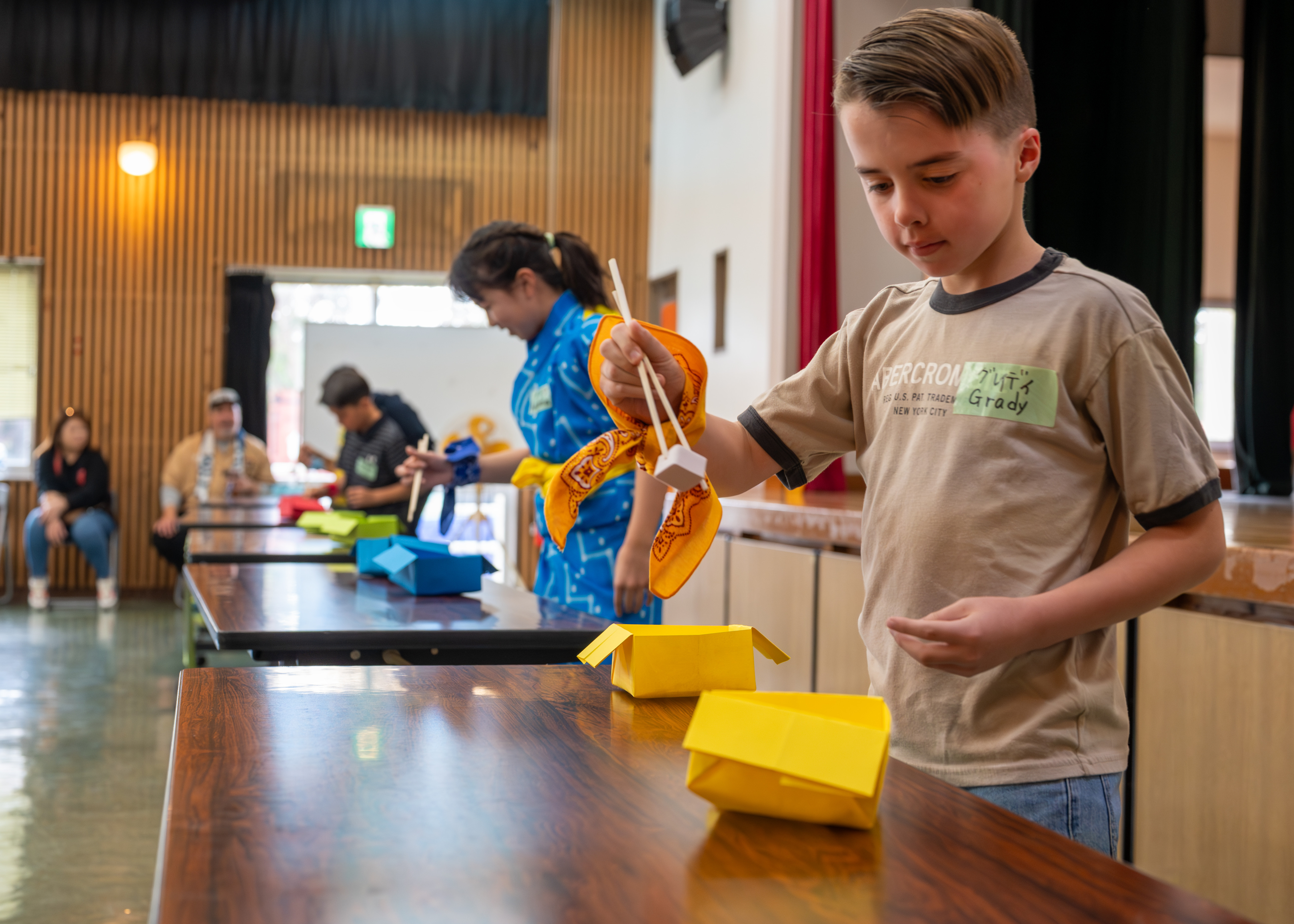 Jewell Langdon, cultural exchange event volunteer, instructs U.S. and Japanese elementary school students during a cultural exchange event at Chatan, Okinawa, Japan, Feb. 21, 2026. During the event, the children participated in various activities, from crafts to traditional games, emphasizing Okinawa’s rich culture and community. (U.S. Air Force photo by Staff Sgt. Gary Hilton)