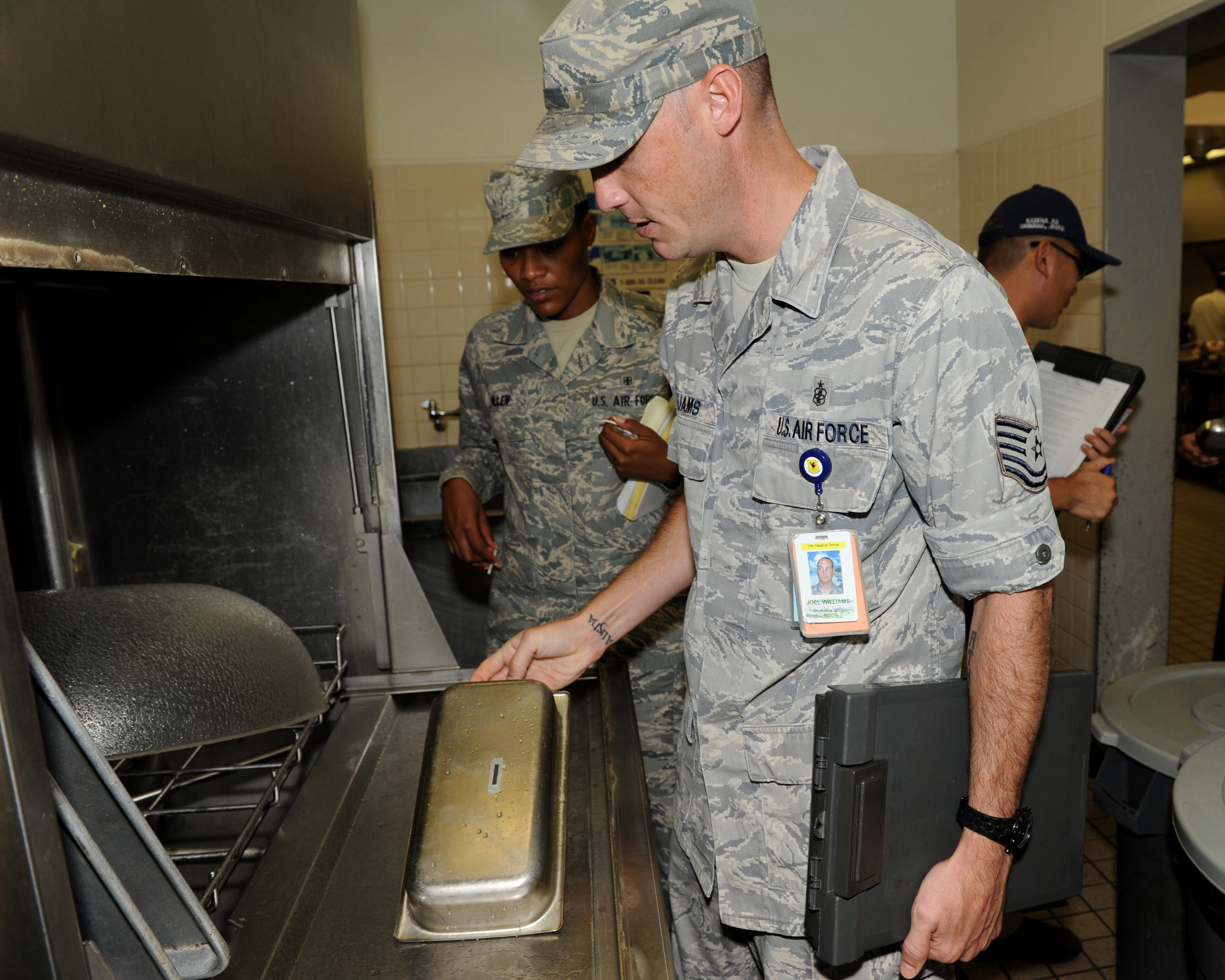U.S. Air Force Tech. Sgt. Joel Williams and Airman 1st Class Brandy Allen, 18th Aerospace Medicine Squadron Public Health technicians, inspect a thermo label sticker that detects proper sanitizing temperatures at the Marshall Dining Facility on Kadena Air Base, Japan, Nov. 8. The public health inspection members help and educate during their food inspection visit and look for many things to include food preparation, proper temperature, food handling, prevention disease, quality and sanitations. (U.S. Air Force photo/Junko Kinjo/released)
