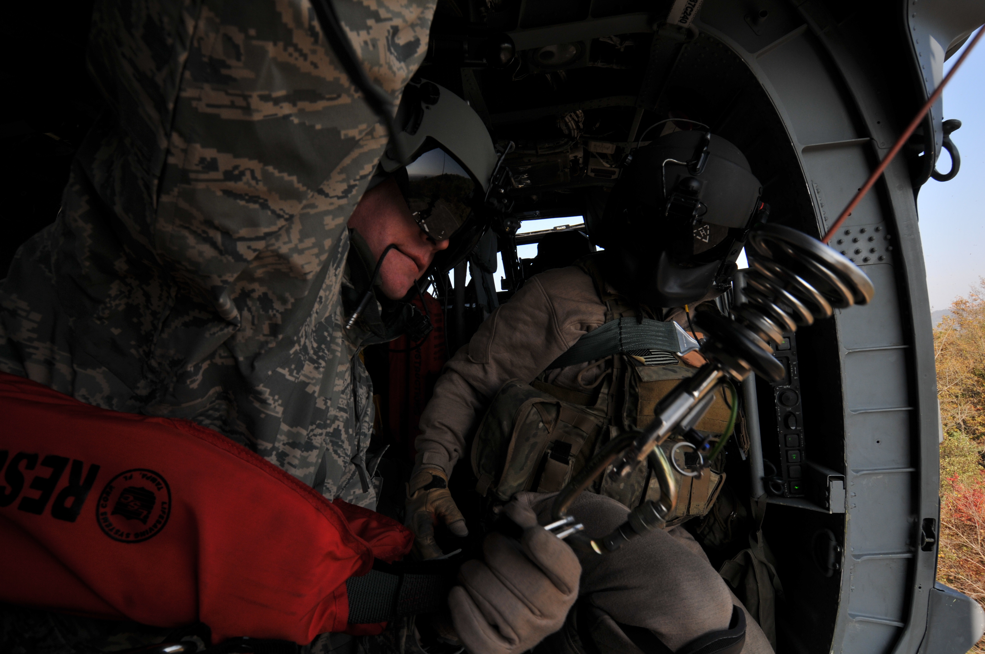 U.S. Air Force Tech. Sgt. Heath Culbertson, 33rd Rescue Squadron HH-60G Flight Engineer, prepares to be hoisted from the helicopter to the ground with the help of 33rd RQS Flight Engineer, U.S. Air Force Staff Sgt. Brandon Taylor, both from Kadena Air Base, Japan during exercise PACIFIC THUNDER Nov. 1, 2011 near Osan Air Base, Korea. PACIFIC THUNDER is a 10-day exercise, from Oct. 31-Nov. 09, at Osan AB, Korea involving the 33rd Rescue Squadron, Kadena AB, Japan, and the 25th Fighter Squadron, Osan AB, Korea. These units work together to practice Combat Search and Rescue tactics to prepare for real-world emergency situations. (U.S. Air Force photo/Tech. Sgt. Angelique Bilog/released)