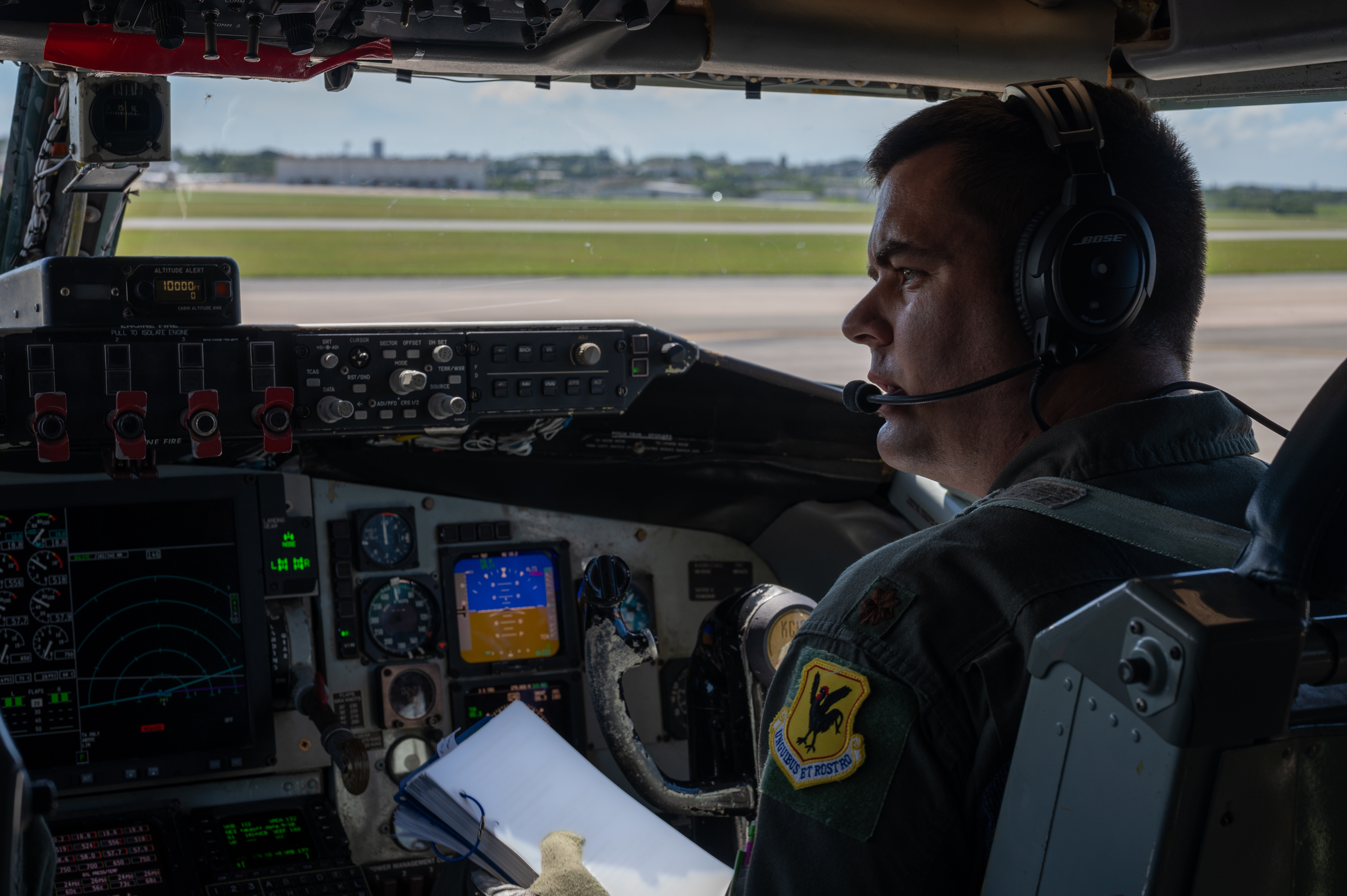 U.S. Air Force Maj. Matthew Waddel, 909th Air Refueling Squadron assistant director of operations, prepares for takeoff in a KC-135 Stratotanker assigned to the 909th ARS at Kadena Air Base, Japan, Oct. 1, 2025. The 909th ARS executes rapid deployment of KC-135s to support a multitude of Pacific Air Force missions, demonstrating Kadena’s commitment to maintaining a free and open Indo-Pacific region. (U.S. Air Force photo by Senior Airman Melany Bermudez)