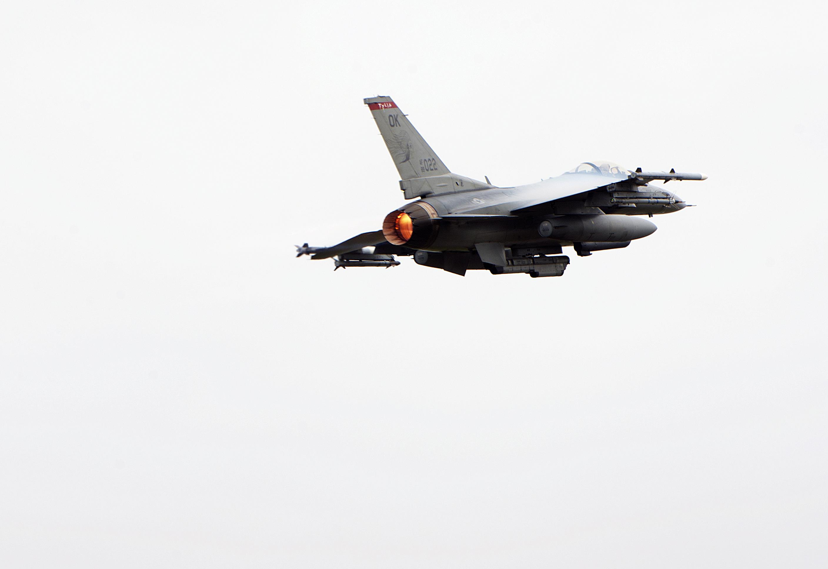 A U.S. Air Force F-16 Fighting Falcon from the 125th Expeditionary Fighter Squadron located at Tulsa Air National Guard Base, Okla, takes off in support of the U.S. Pacific Command Theater Security Package Dec. 15, 2015, at Kadena Air Base, Japan. Movement of U.S. Air Force TSPs into this region has been a routine and integral part of U.S. Pacific Command's force posture since March 2004. (U.S. Air Force photo by Naoto Anazawa)