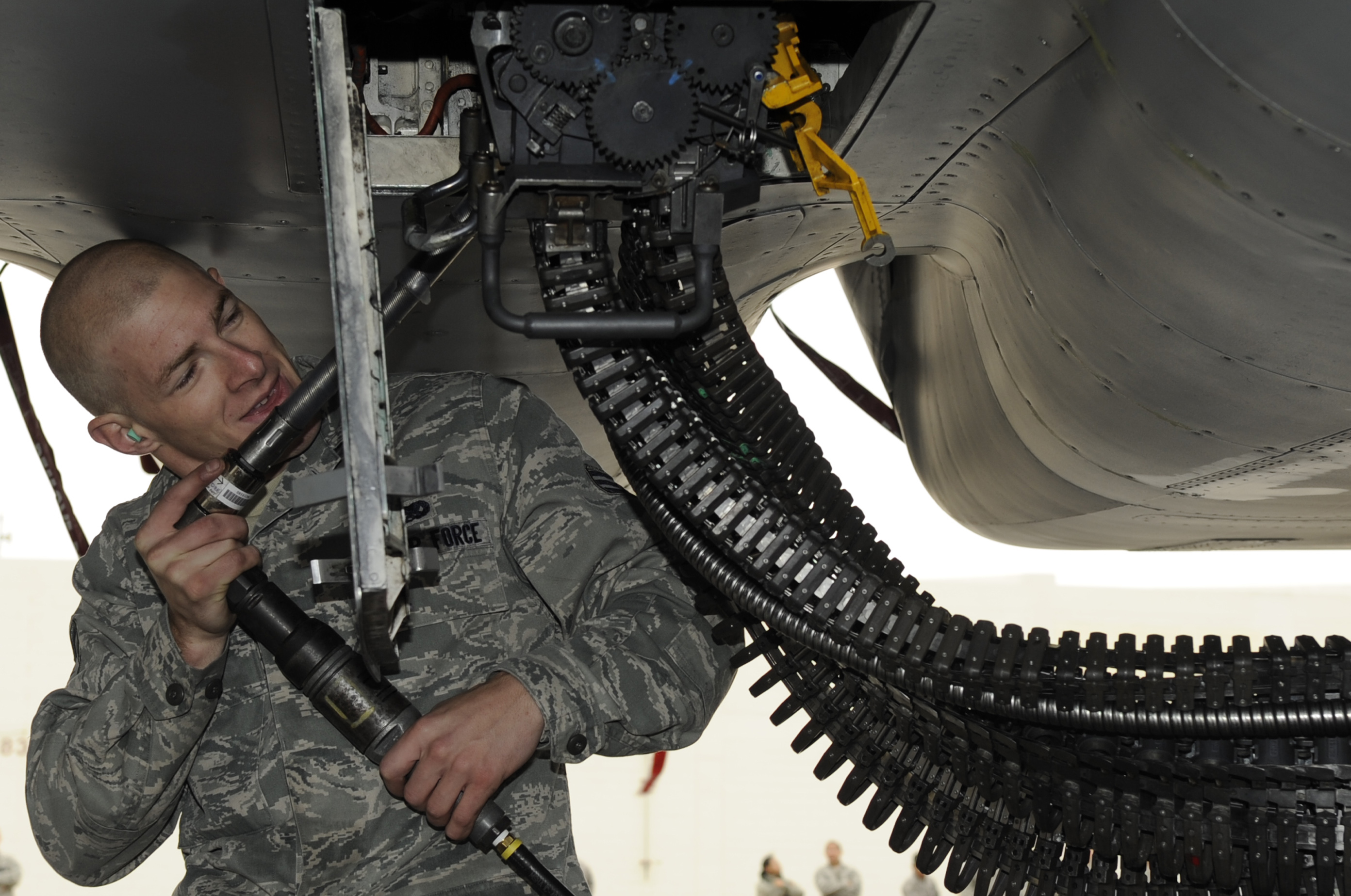 U.S. Air Force Senior Airman Cory Henry, 44th Aircraft Maintenance Unit weapons load crew member, simulates loading bullets into an F-15 Eagle during a weapons load competition on Kadena Air Base, Japan, Jan. 13, 2014. Competitions promote teamwork among weapons load crews and allow supervisors to evaluate their teams’ strengths and weaknesses while under pressure. (U.S. Air Force photo by Senior Airman Marcus Morris)