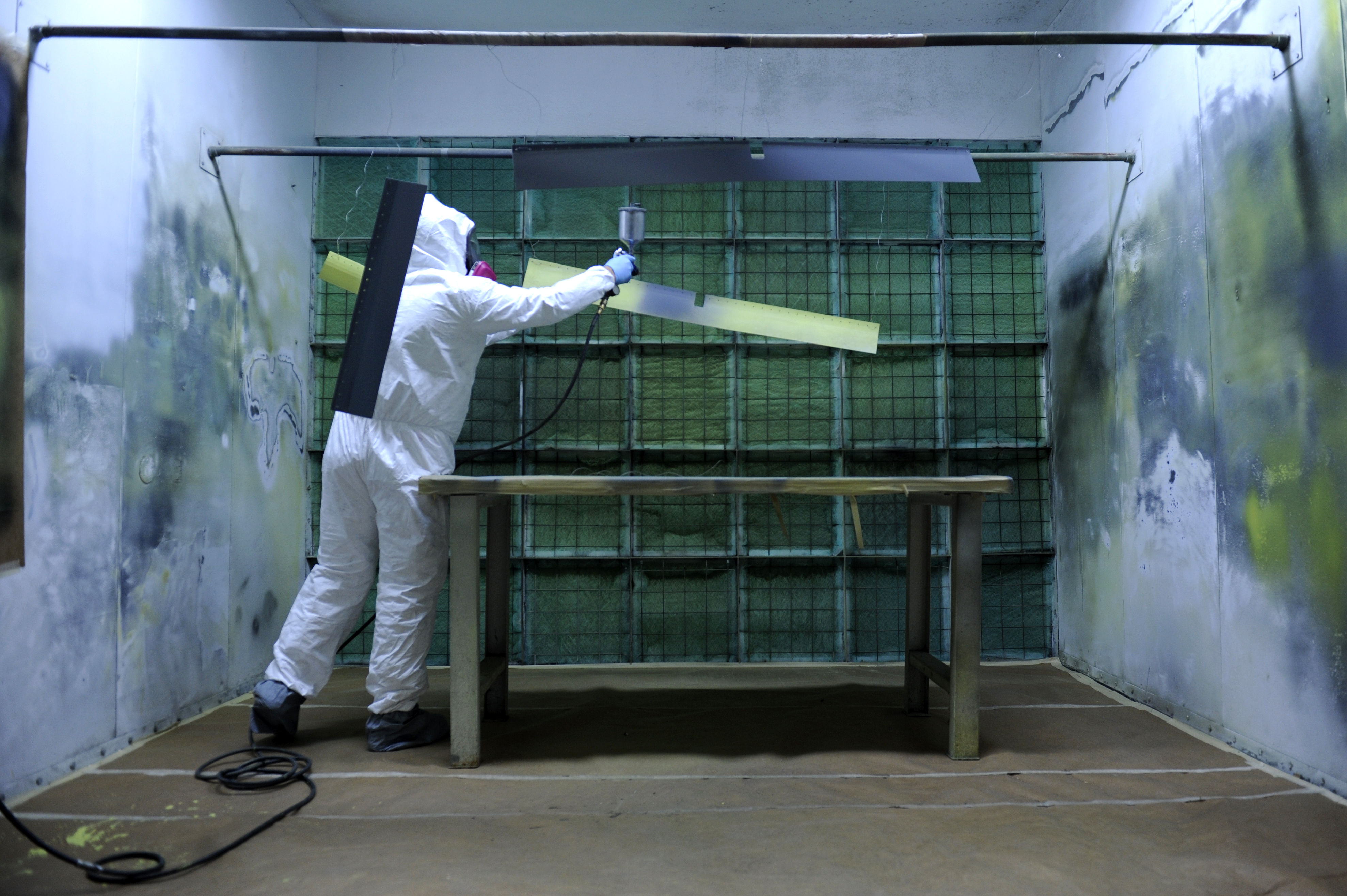 U.S. Air Force Staff Sgt. Jordan Smith, 18th Equipment Maintenance Squadron aircraft structural maintenance technician who hails from Lawton, Mich., spray paints aircraft parts on Kadena Air Base, Japan, Nov. 21, 2013. Whether it's replacing a $3 bolt or repairing a $1.5 million KC-135 Stratotanker aileron, the Aircraft Structural Maintenance flight gives the U.S. Air Force an unmatched reach and presence in the Asia Pacific Region and is vital to the successful mission of the 18th Wing. (U.S. Air Force photo by Senior Airman Maeson L. Elleman)