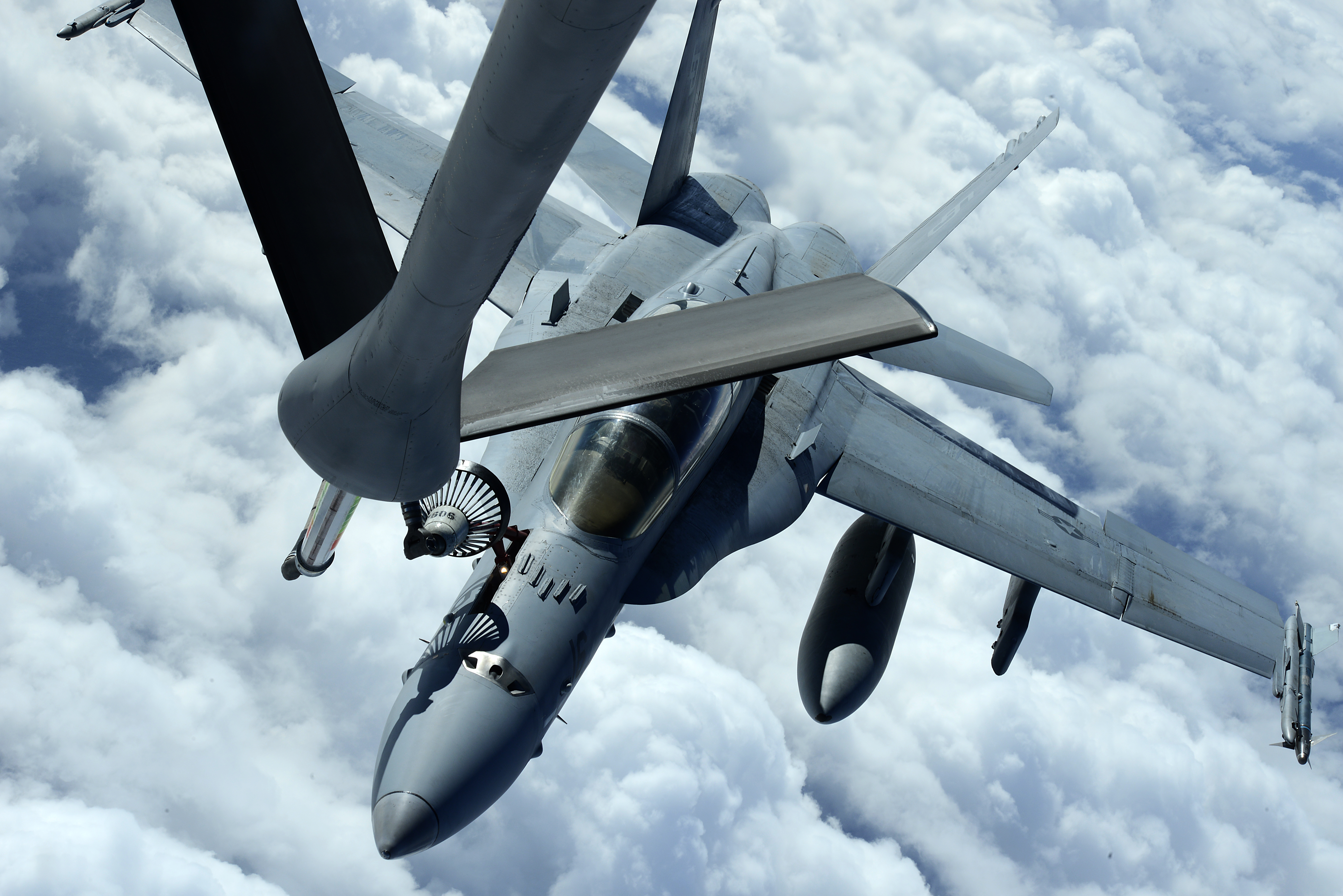 A U.S. Marine Corps F/A-18 Hornet from the Marine All-Weather Fighter Attack Squadron 533, stationed at Marine Corps Air Station Beaufort, S.C., refuels from a U.S. Air Force 909th Air Refueling Squadron KC-135 Stratotanker Jan. 23, 2015. The mission of VMFA(AW)-553 is to conduct joint and combined aviation operations in order to support a Marine Air Ground Task Force commander's command and control, intelligence, fires, maneuver and force protection warfighting functions. The 909th ARS is stationed on Kadena Air Base, Japan, and is a vital component to the extended reach of U.S. and allied forces within the Pacific theater. (U.S. Air Force photo by Senior Airman Maeson L. Elleman)