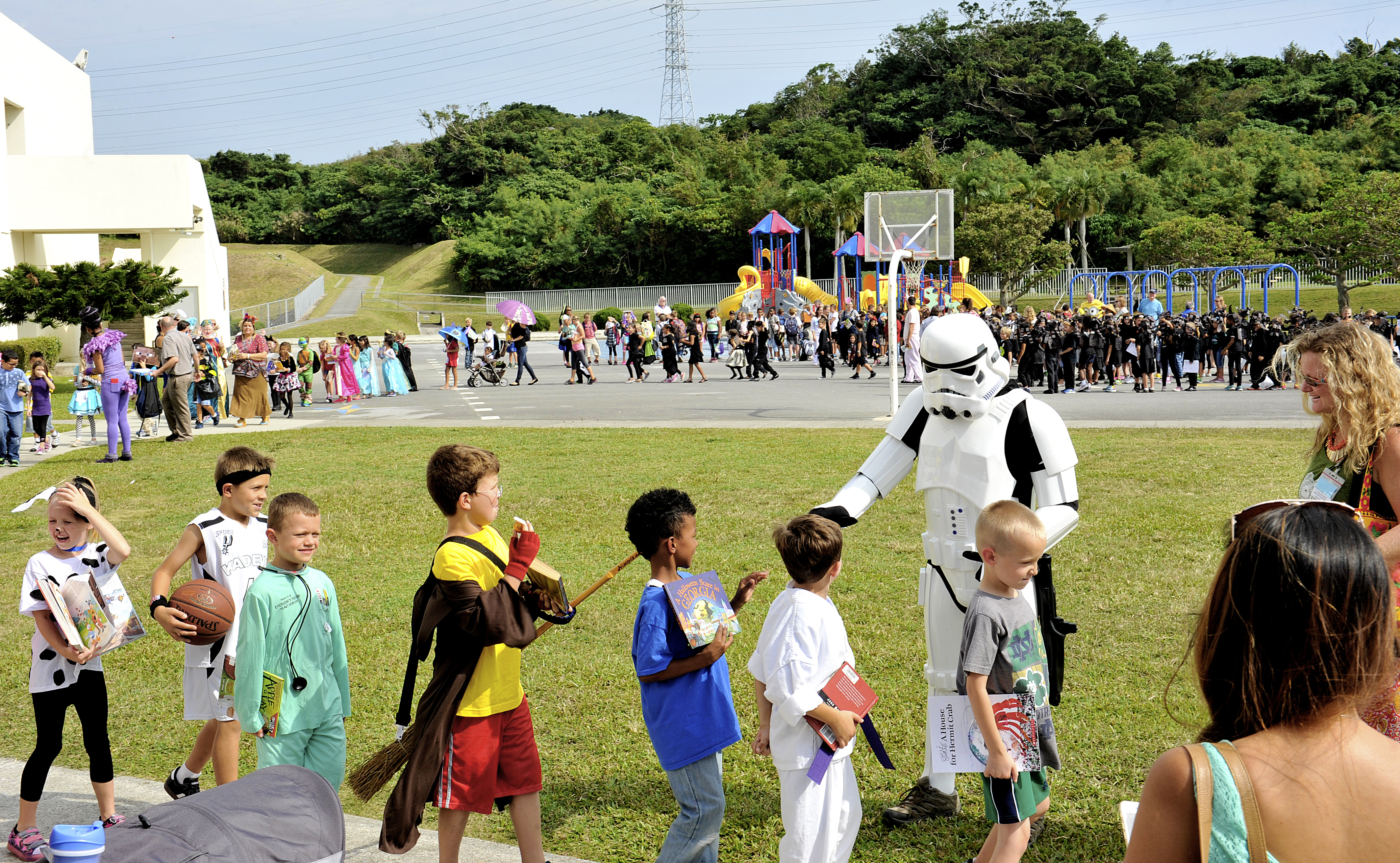 Approximately 500 children from Stearley Heights Elementary School walk as their favorite storybook characters in a school parade Oct. 30, 2015, at Kadena Air Base, Japan. Children from kindergarten to 5th grade participated in the event to celebrate the benefits of reading and writing. (U.S. Air Force photo by Naoto Anazawa)