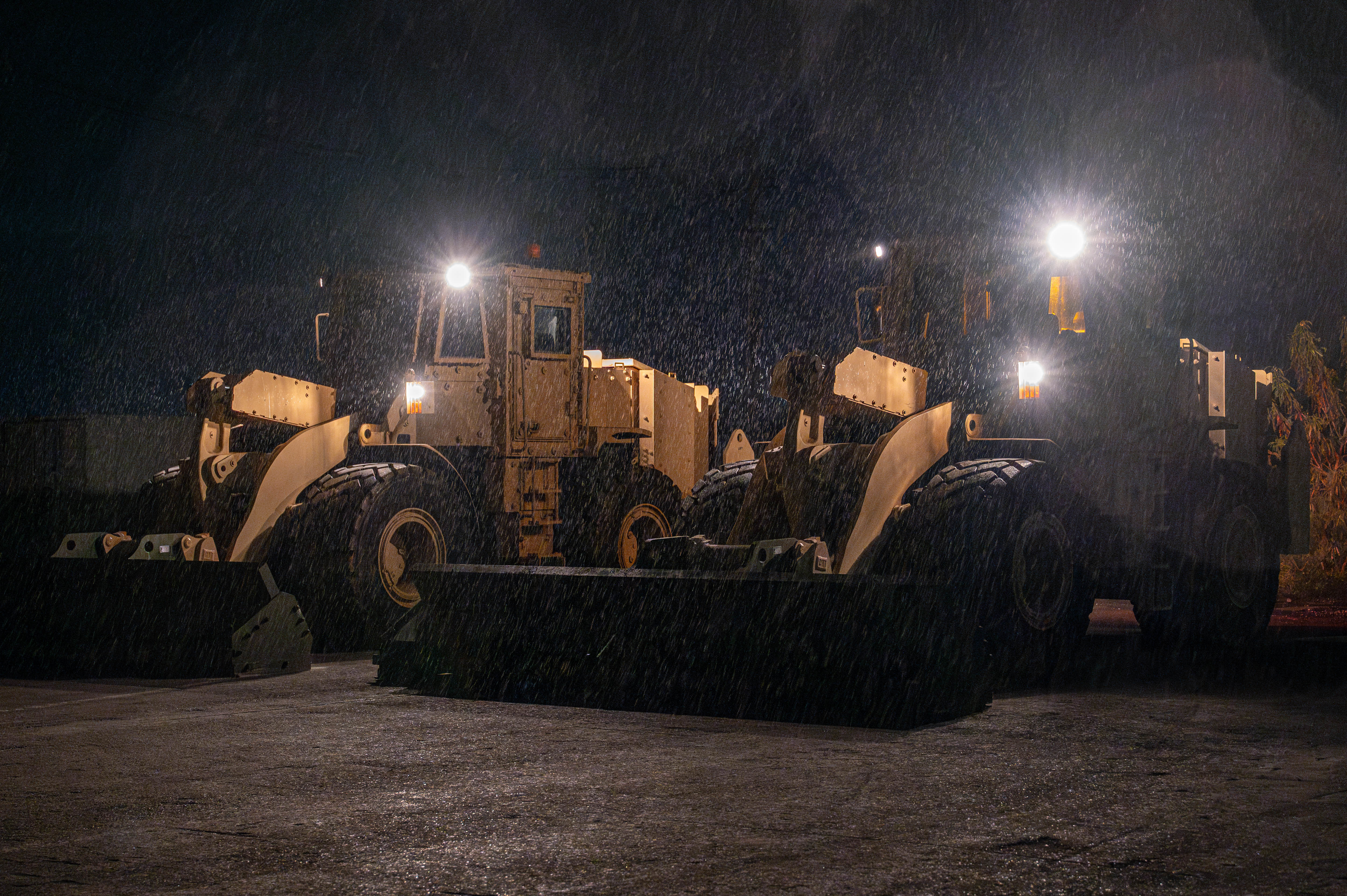 U.S. Air Force front end loaders assigned to the 18th Civil Engineer Squadron conduct a simulated rapid airfield damage recovery during a routine readiness exercise at Kadena Air Base, Japan, May 6, 2025. RADR capabilities are necessary due to Kadena’s strategic position as a vital staging location for forces to deter regional adversaries and project U.S. airpower throughout the Indo-Pacific. (U.S. Air Force photo by Senior Airman Catherine Daniel)
