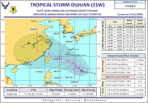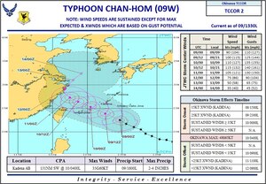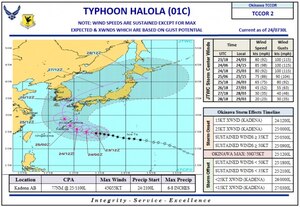 As of 5 a.m. local time here, The 18th Wing commander, Brig. Gen. Barry Cornish, has directed Tropical Cyclone Condition of Readiness 2.At 3 a.m., Typhoon Halola, with winds gusting to 100 knots near its center, was located 300 nautical miles southeast of Kadena, moving west at 8 knots.Currently,